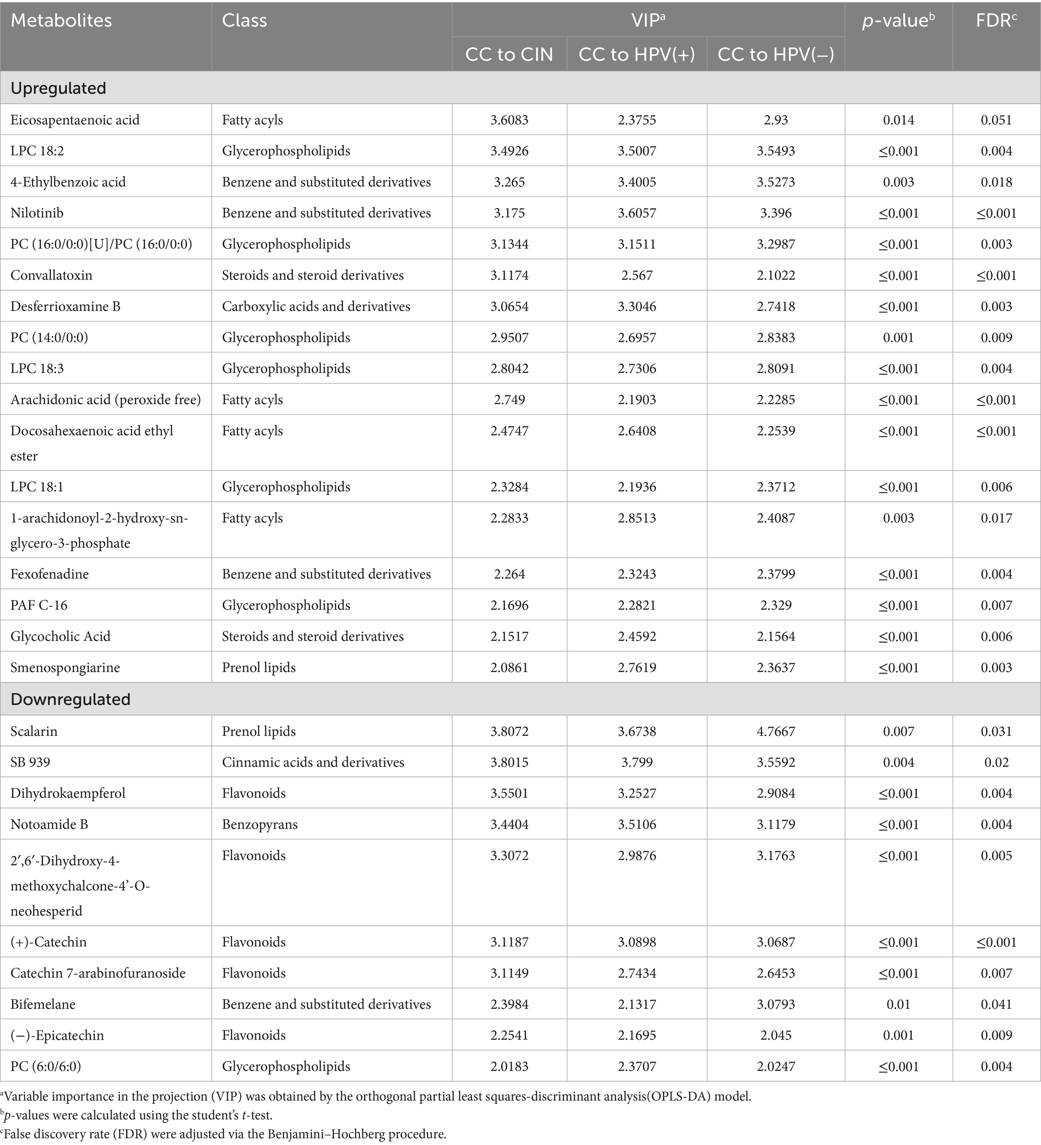 A total of 320 vaginal lavage samples were collected from female patients undergoing gynecological examinations for non-targeted metabolomics analysis at the First Affiliated Hospital of Chongqing Medical University in China from January 2021 to May 2021. The characteristics of the patients and their demographic information have been previously detailed (19). This study was approved by the Ethics Committee of the First Affiliated Hospital of Chongqing Medical University (Ethics NO. 2023-24). Based on the HPV test, ThinPrep liquid-based cytology test (TCT), and biopsy pathology, the participants were classified into four groups: cervical cancer group (CC) group, HPV-positive with cervical intraepithelial neoplasia group (CIN), HPV-positive without cervical lesions [HPV (+)] and HPV-negative healthy control group [HPV (−)], with 80 cases in each group. The TellgenplexTM HPV DNA (real-time PCR) Test (Tiansheng Biotech Co., Ltd., Shanghai, China), targeting the L1 gene, was utilized for 14 HR-HPV subtypes (16, 18, 31, 33, 35, 39, 45, 51, 52, 56, 58, 59, 66, and 68) assay. For histopathological diagnosis, two gynecologic pathologists independently reviewed 4 μm formalin-fixed paraffin sections stained with hematoxylin–eosin (H&E), in accordance with the WHO 2020 classification guidelines. The inclusion and exclusion criteria are previously described (19). In short, participants in this study included individuals aged 20 years and older who were sexually active, and provided written informed consent. Specifically, pregnant, breastfeeding, or menstruating females; those who had sexual intercourse or vaginal lavage within the past week; those who have used antibiotics within the past month; those receiving long-term hormones or immunosuppressants therapy; or those who have undergone cervical surgery were excluded. Additionally, 32 vaginal lavage samples were collected for targeted metabolomic detection following the same inclusion and exclusion criteria and classification into four groups. Patient characteristics and demographic information are provided in Supplementary Table 1.