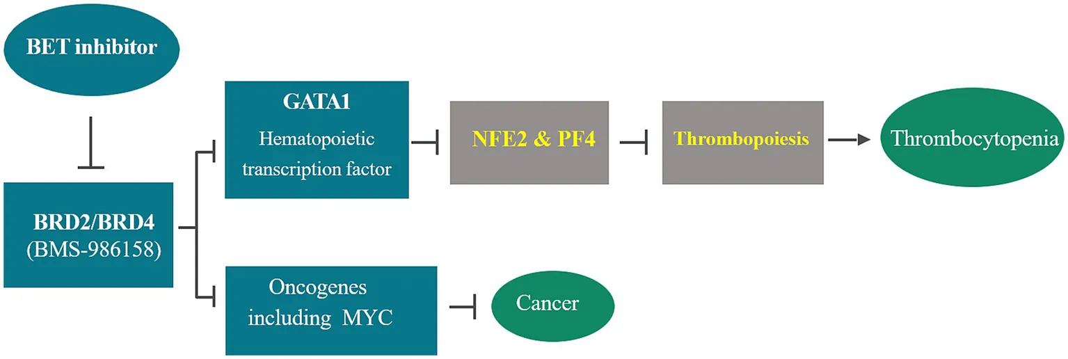 The consistent downregulation of GATA1, NFE2, and PF4 transcription within hours post-BMS-986158 treatment in both preclinical and clinical studies demonstrates that BET inhibitors induce thrombocytopenia by altering GATA1 gene expression and its downstream genes, NFE2 and PF4, which regulate megakaryopoiesis and thrombopoiesis. Early detection of transcriptional changes in blood samples during treatment courses positions NFE2 and PF4 as promising biomarkers for proactively monitoring and mitigating treatment-emergent thrombocytopenia.