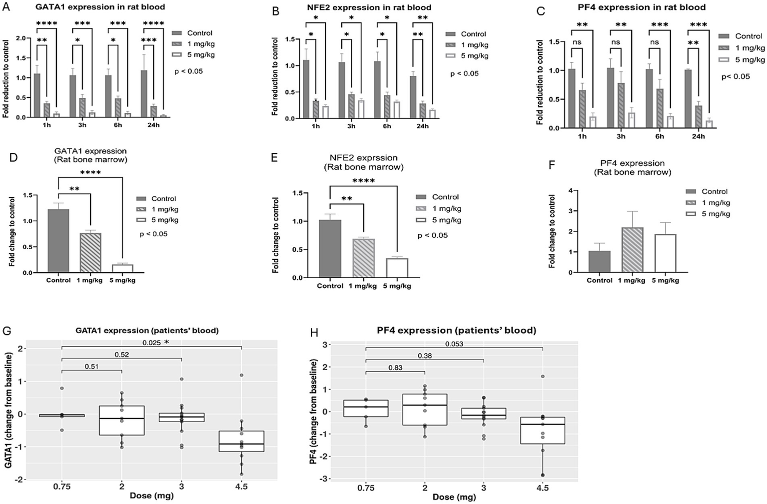 In the clinical study among all patients, the transcriptional expressions of GATA1 and PF4 exhibited dose-dependent downregulation (Figures 3G,H). GATA1 showed a statistically significant change from baseline when comparing the lowest dose group (0.75 mg) to the highest dose group (4.5 mg).