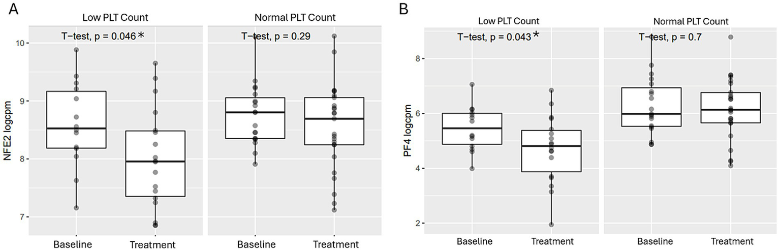 The data also revealed that patients with thrombocytopenia (defined as < 150×103/μl and > 0.5 Log2 fold change in platelet count from baseline) had significantly greater NFE2 and PF4 genes downregulation compared to those with normal platelet counts (Figures 4A,B).