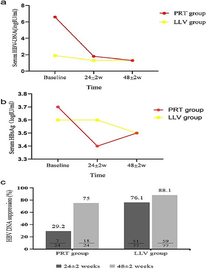 Figure 2. Dynamic change of virological [(a) serum HBV DNA level, (c) HBV DNA suppression rate] and serological biomarker [(b) serum HBsAg level] response during 24 ± 2w and 48 ± 2w of TAF therapy in PRT group and LLV group.