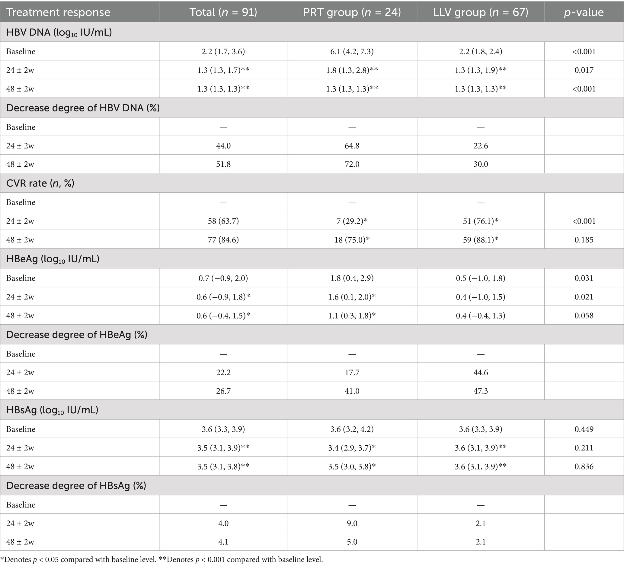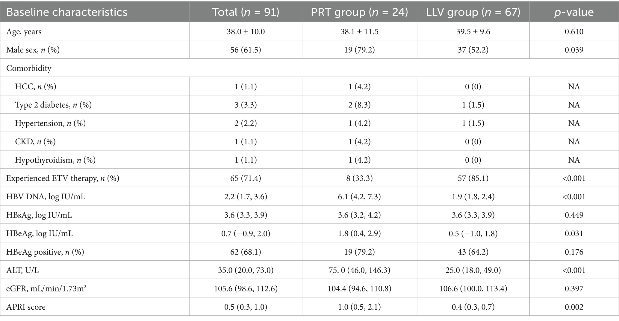 A total of 95 CHB treatment-experienced patients who met the criteria were enrolled, of whom 4 dropped out of the study. The number of patients in the PRT and LLV groups was 24 and 67, and the baseline characteristics of patients were showed in Table 1. The LLV group had a lower proportion of male sex, lower HBV DNA levels, lower HBeAg levels, lower ALT levels, and a lower APRI score, while a higher proportion of ETV experienced treatment (p < 0.05).