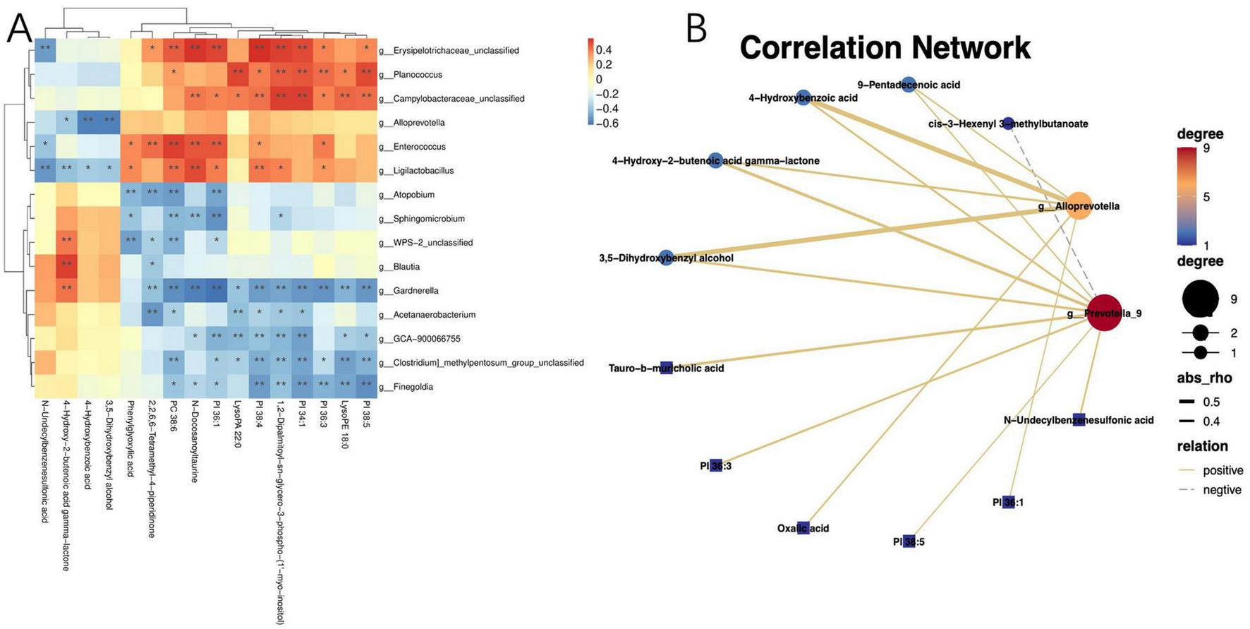 Correlation between the gut microbiota and metabolites. (A) Heatmap of joint analysis of metabolomics and gut microbiota; (B) diagram of differential metabolites and differential microbiota network regulation. “*” indicates P < 0.05 for comparison between two groups. “**” indicates P < 0.01 for comparison between two groups.