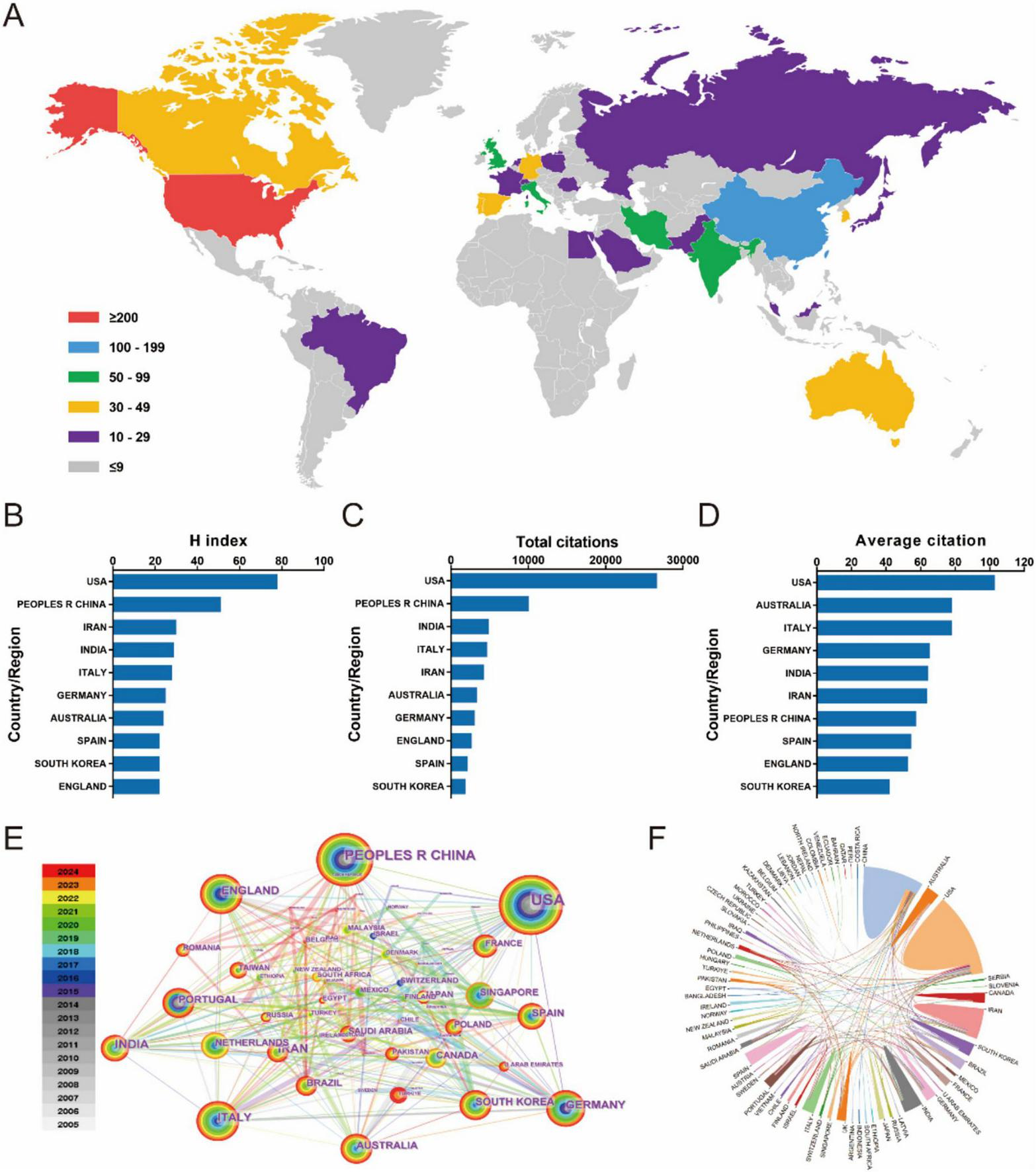 (A) The distribution of biomaterial-driven regenerative drug delivery from 2005 to 2024. (B–D) H index, total citations, and average citation. (E) Country/region network visualization produced across 77 countries/regions worldwide. (F) Country/region crosschord charts.