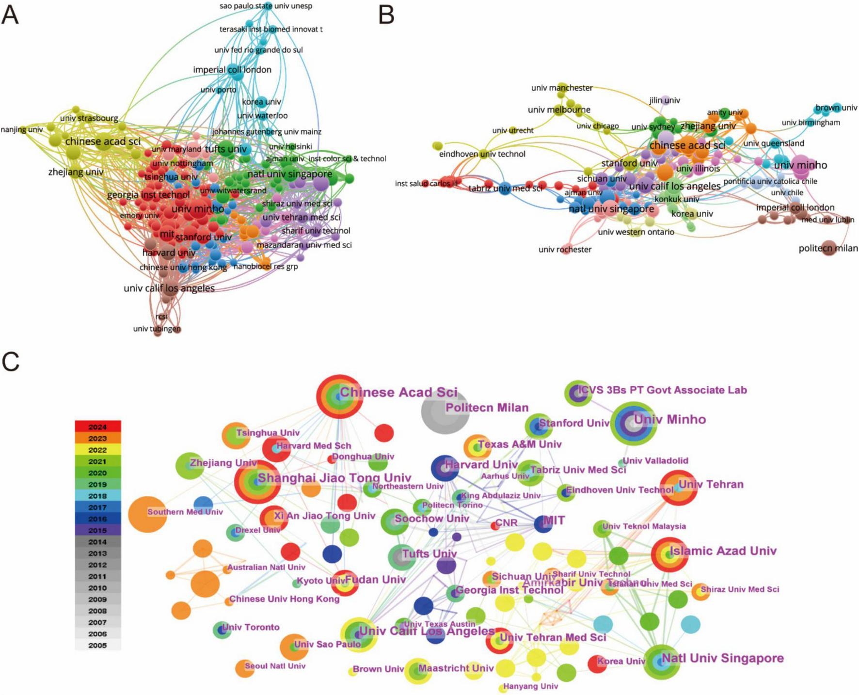 (A) Analysis of country/regional collaboration using Vosviewer. (B) Analysis of institutional collaboration using Vosviewer. (C) Institution network visualization produced using CiteSpace.