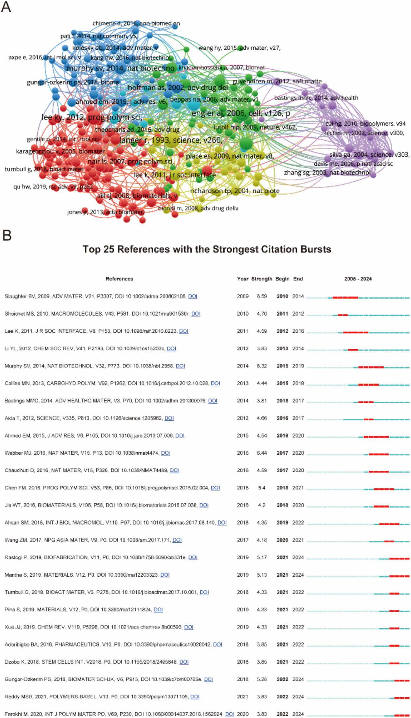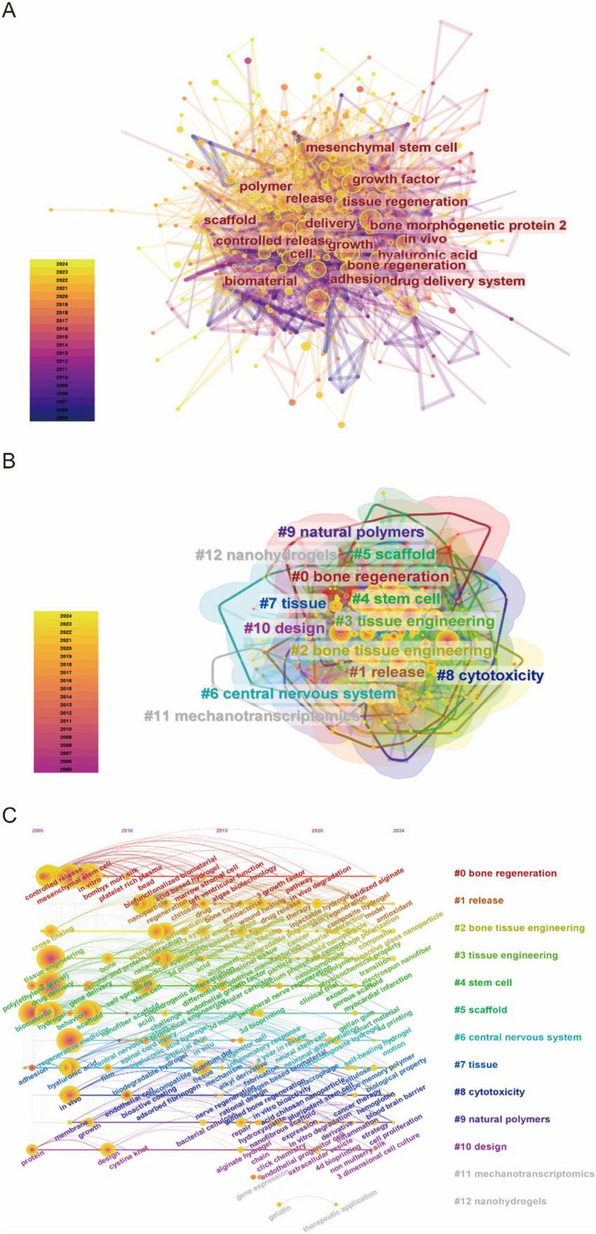 Figure 4 illustrated the global research landscape in biomaterial-driven regenerative drug delivery, mapping country-level contributions, institutional affiliations, and key authors. Figure 4A highlighted the dominance of the USA and China, with leading institutions such as the University of California System, Zhejiang University, and the Chinese Academy of Sciences playing pivotal roles. Prominent researchers, including Kaplan DL, Mano JF, and Ramakrishna S, were linked to these institutions. Figure 4B expanded the scope, showcasing a broader international network, with new contributors from Japan, Saudi Arabia, and Canada, as well as additional universities such as Tehran University of Medical Sciences and Soochow University. Collectively, these multi-dimensional visualizations confirmed two critical trends: the formation of self-reinforcing academic ecosystems among top-tier institutions, and the increasing globalization of interdisciplinary research in advanced therapeutic development. The convergence of spatial network density and temporal expansion metrics underscored the field’s transition toward increasingly complex, internationally integrated research paradigms.