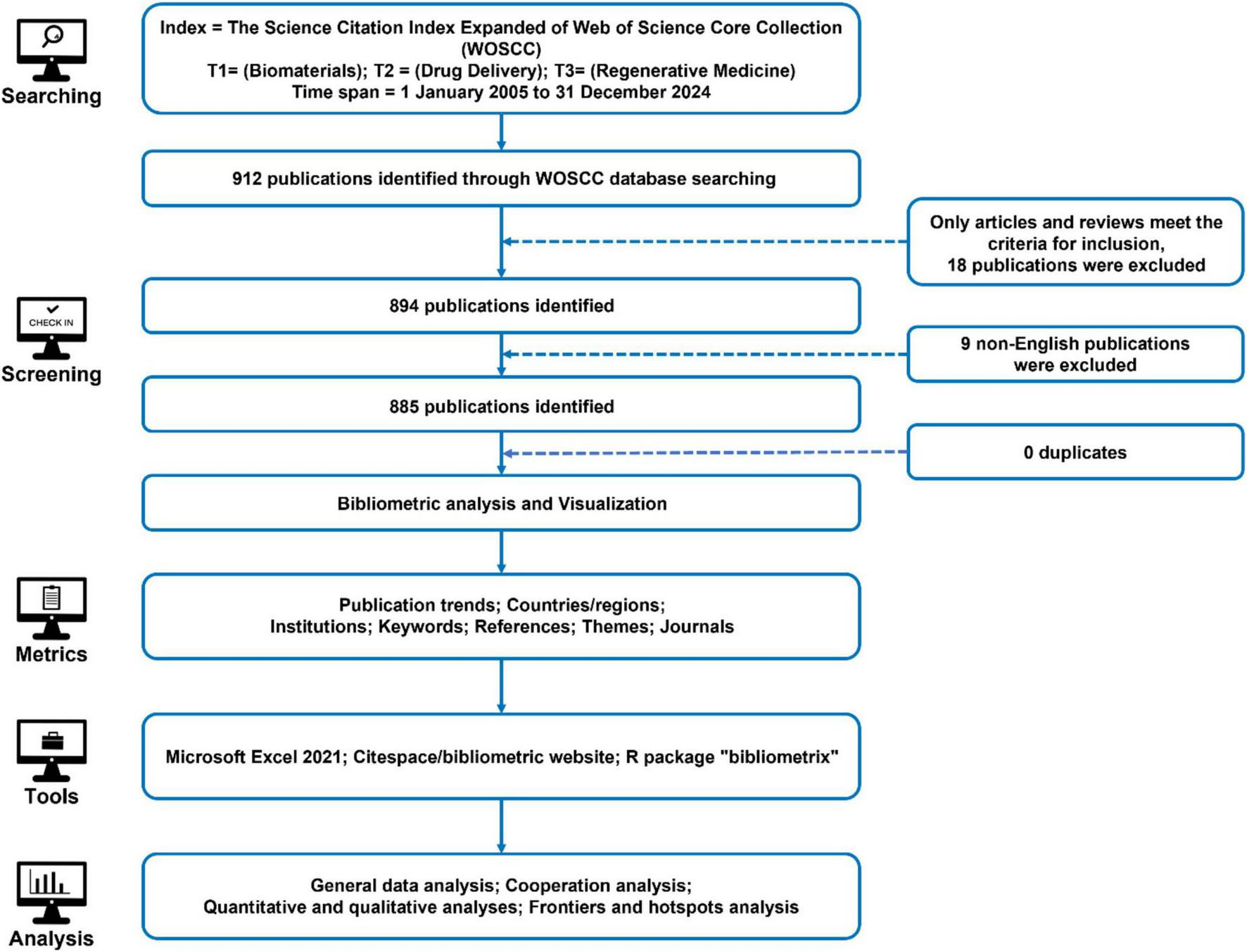 Given the dynamic evolution of biomaterial-driven regenerative drug delivery research, implementing systematic and rigorous examination of scholarly literature emerges as an essential endeavor to refine our comprehension of the discipline’s evolving knowledge architecture. While an extensive body of articles has documented technological breakthroughs, translational barriers, and marketization trajectories within the field, such syntheses frequently demonstrate limitations in empirical methodology—particularly the overreliance on qualitative assessments rather than quantitative, data-driven evidence. This methodological gap potentially introduces variability and interpretive biases, thereby compromising systematic identification of established paradigms, core thematic priorities, and emerging frontiers. The imperative for methodological innovation in landscape analysis has been further amplified by contemporary global health exigencies, necessitating timely recalibration of conceptual frameworks to reflect post-pandemic scientific realities.
