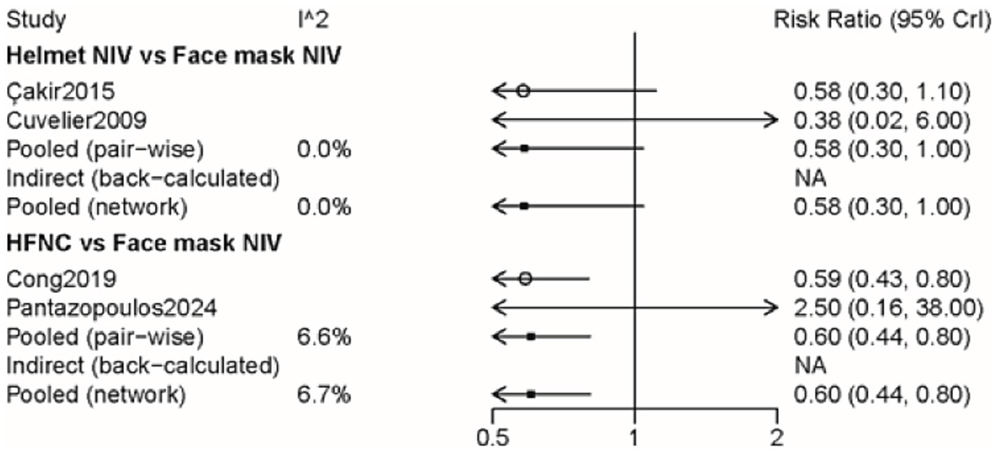 | Helmet NIV | 2.32 (0.92, 7.01) | Helmet NIV | 2.26 (0.83, 7.2) | 0.53 (0.02, 6.45) |