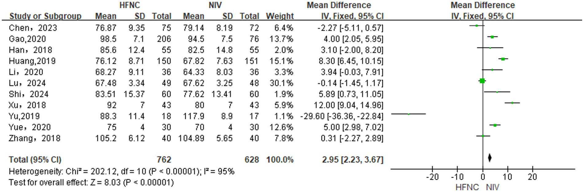 Inter-group comparison of the difference in PaO2 levels incorporated 10 RCTs (13, 14, 17–22, 28, 30) and 1 NRCT (32). With the use of a random-effects model (p < 0.00001, I2 = 95%), HFNC significantly improved PaO2 over NIV [MD = 2.95, 95% CI (2.23, 3.67), p < 0.00001], as shown in Figure 2.