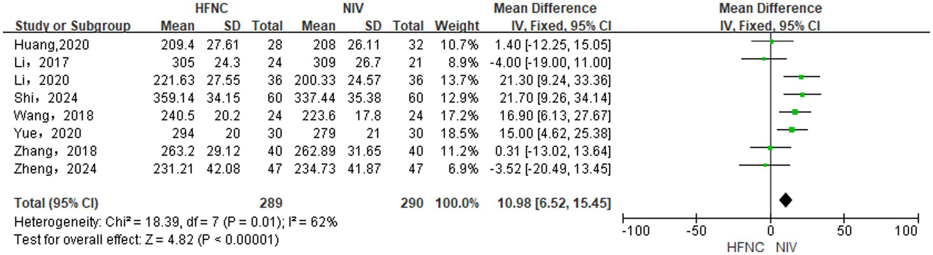 ![Forest plot displaying mean differences between HFNC and NIV across various studies. Each study is listed with mean, standard deviation, total, and weight. The plot shows effect sizes as green squares, with confidence intervals as horizontal lines. The overall mean difference is −6.15, with a 95% confidence interval of [−6.86, −5.44]. Heterogeneity is indicated by Chi-squared 696.43, degrees of freedom 11, and I-squared 98%. The overall effect Z-score is 16.97 with a p-value < 0.00001.](https://www.frontiersin.org/files/Articles/1594145/fmed-12-1594145-HTML-r1/image_m/fmed-12-1594145-g007.jpg)