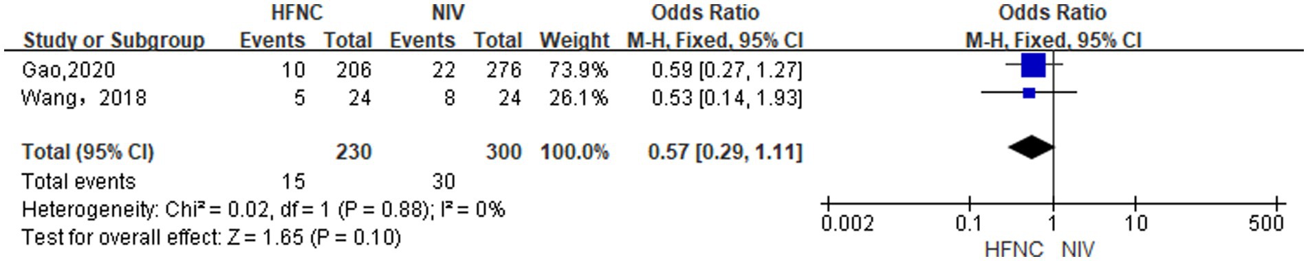 ![Forest plot comparing HFNC and NIV therapies for two studies. Odds ratio with 95% confidence intervals shows combined effect at 0.57 [0.29, 1.11], indicating no significant difference. Heterogeneity is zero, and the overall test effect indicates Z = 1.65 with P = 0.10.](https://www.frontiersin.org/files/Articles/1594145/fmed-12-1594145-HTML-r1/image_m/fmed-12-1594145-g006.jpg)