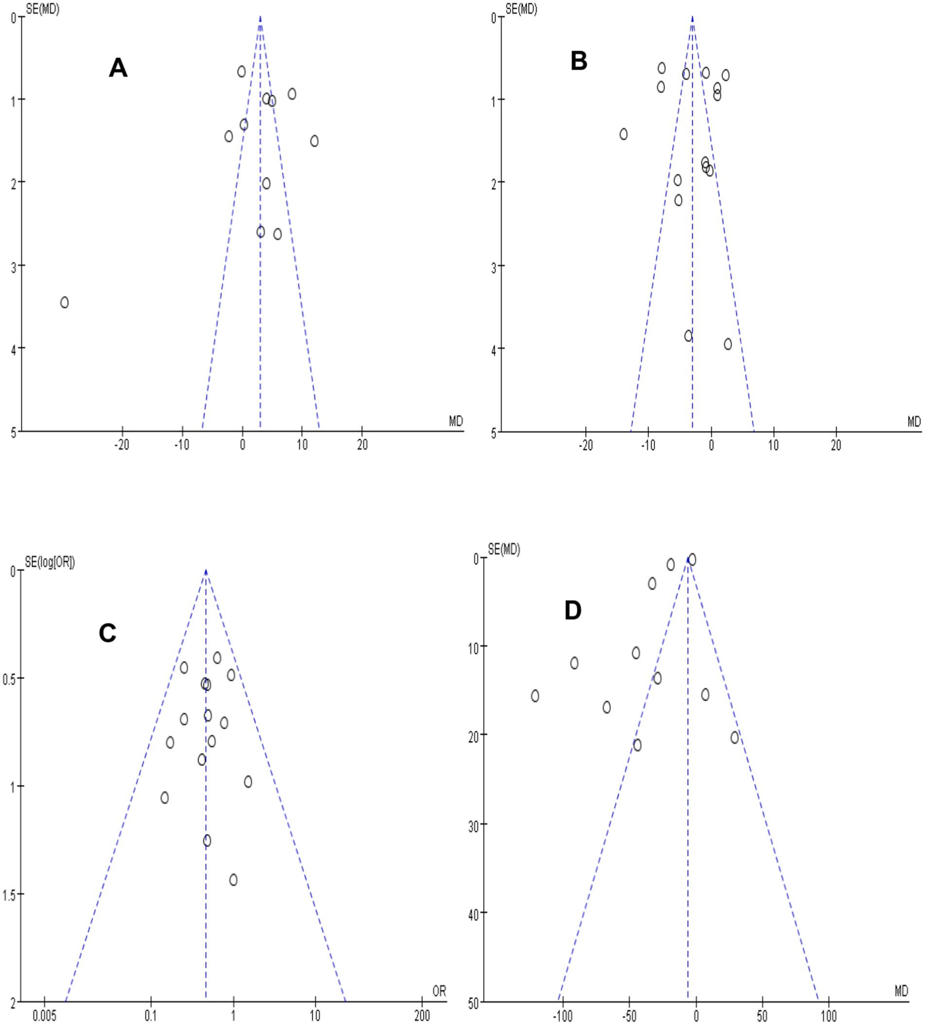 Meta-analysis was conducted using RevMan 5.3, with mean difference (MD) and odds ratio (OR) for continuous variables and dichotomous variables, respectively, both reported with 95% confidence intervals (CI). According to the assessment of heterogeneity using I2 and p-values, fixed-effects model and random-effects model were, respectively, adopted when there was low (p > 0.1 and I2 < 50%) and high heterogeneity (p ≤ 0.1 and I2 ≥ 50%) (12), with sensitivity analysis employed to identify heterogeneity sources. Sensitivity analysis was performed by removing individual studies to assess their impact on the overall results. Finally, forest and fennel plots were generated to indicate the meta-analysis results, and assess publication bias, respectively. Statistical significance was set at p < 0.05.