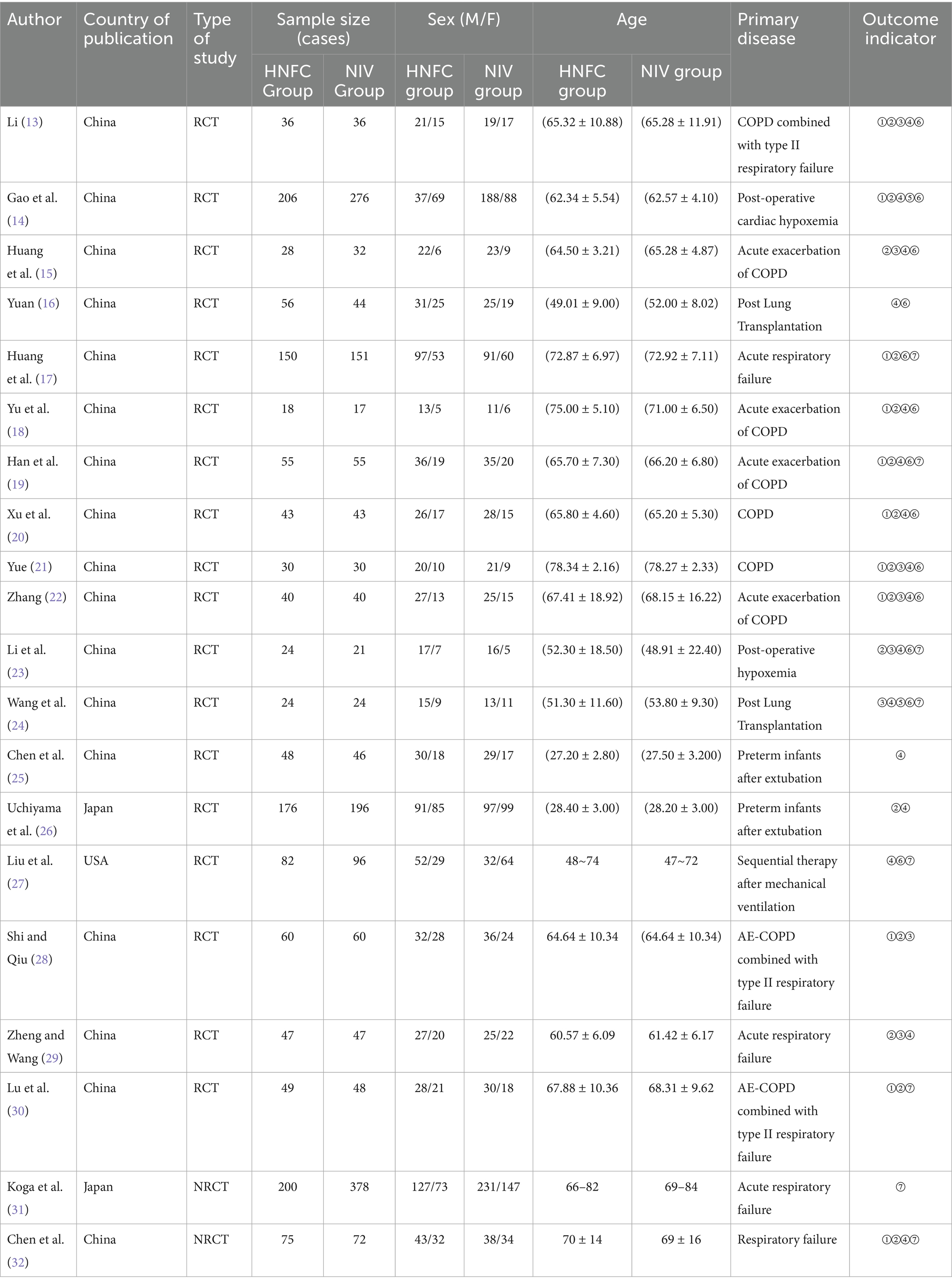Initially, 959 articles were retrieved from PubMed, Web of Science, CNKI, and Wanfang databases. Finally, 20 (13–32) studies [18 RCTs (13–30) and 2 NRCTs (31, 32)] were included for meta-analysis after removing 389 duplicates, 272 irrelevant articles, 195 non-compliant studies, 65 reviews, and 18 articles with incomplete data. These studies involved 3,159 patients, including 1,447 in the HFNC group and 1,712 in the NIV group. The screening process is detailed in Figure 1, and the baseline characteristics of the included studies are summarized in Table 1.