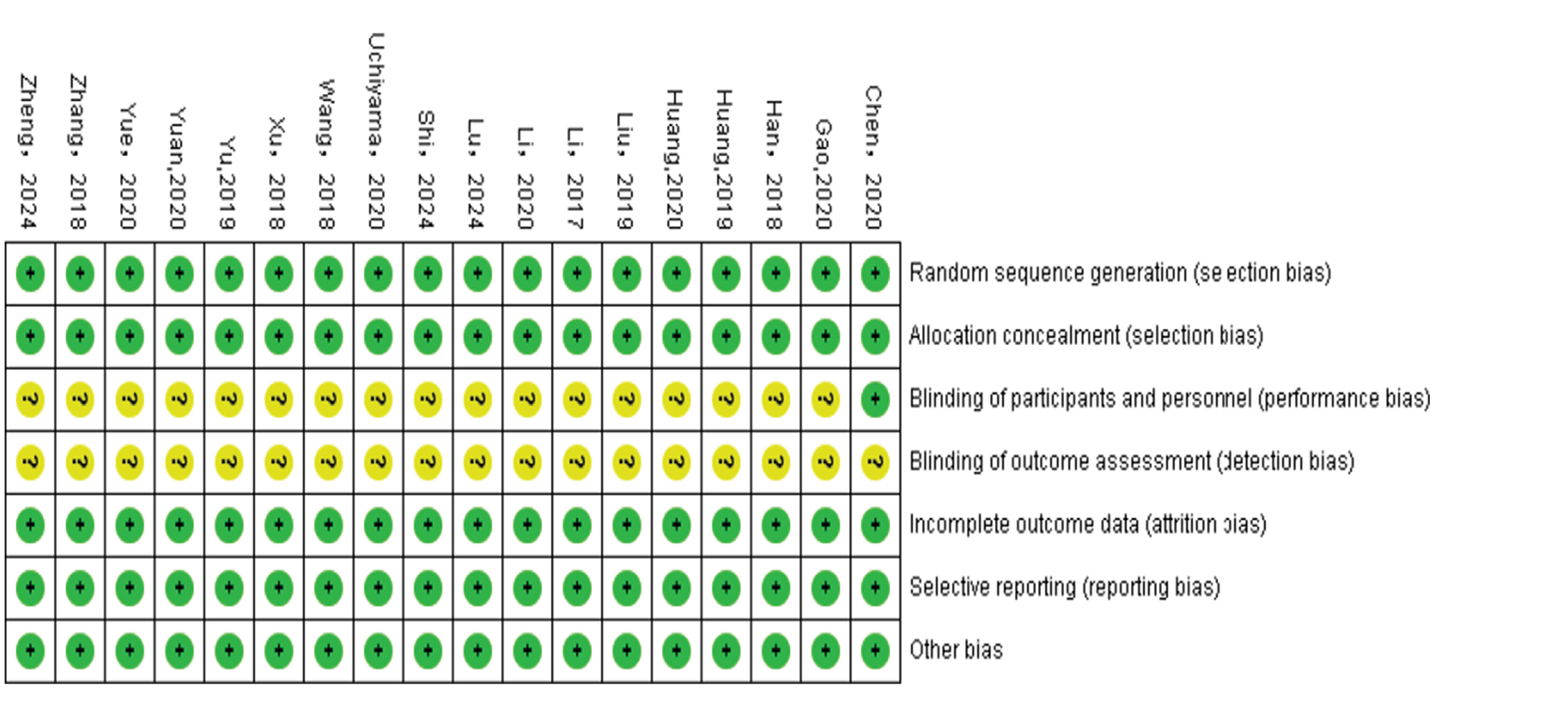 The quality of the included eligible studies was independently assessed by two researchers using the Cochrane Handbook for Systematic Reviews of Interventions and Review Manager (RevMan) software version 5.3. Evaluation criteria encompassed: random sequence generation, allocation concealment, blinding of participants and personnel, blinding of outcome assessment, incomplete outcome data, selective reporting, and other potential sources of bias. Based on the risk of bias scores, literature quality was categorized as low risk (≥5 points), moderate risk (3–4 points), or high risk (1–2 points) (11).