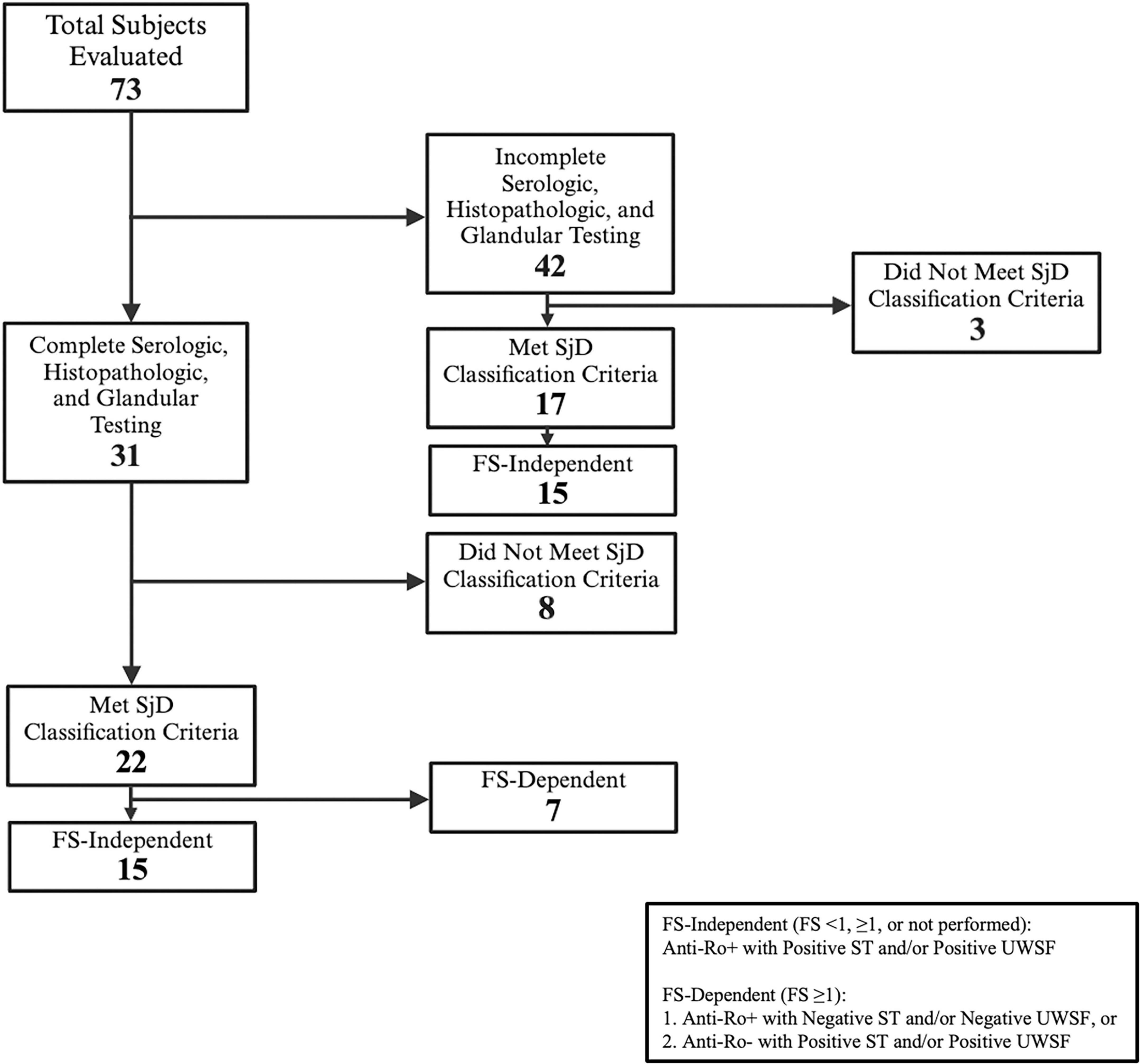 Figure 1. Flowchart of subjects evaluated for Sjögren’s Disease. Representation of subjects who underwent testing for either all or some components of the 2016 ACR/EULAR SjD classification criteria. Classification status is determined for all subjects with sufficient testing. FS-independence or FS-dependence is determined for all subjects who met SjD classification criteria and completed sufficient testing to be categorized.