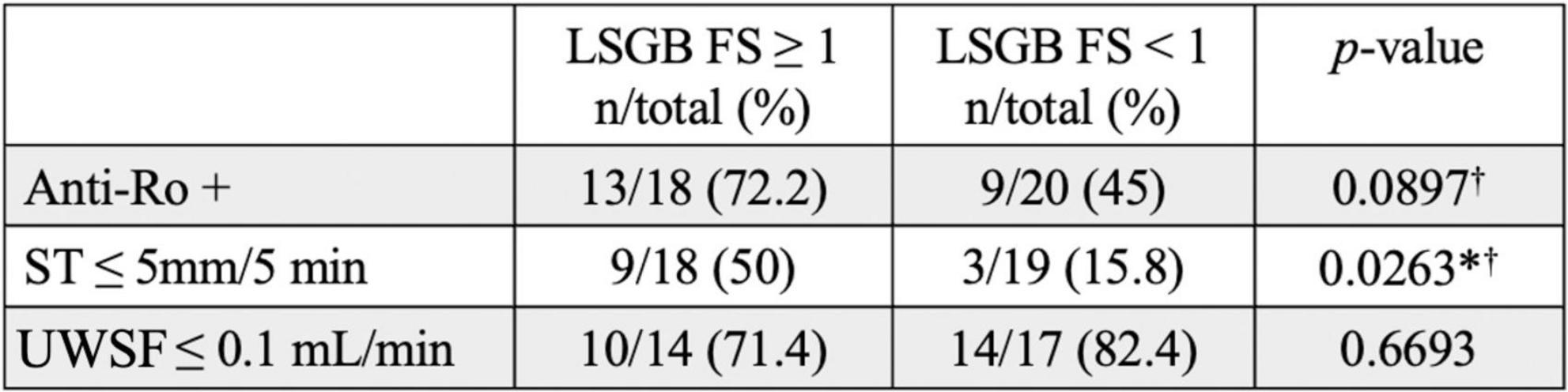 Figure 2. Abnormal ST is significantly associated with abnormal LSGB focus score. Percentages of subjects with positive serologic and oral/ocular dryness testing (ST and UWSF) are listed for those with positive and negative LSGB. Unless indicated (†: Chi-squared test), P-values were calculated by Fisher’s test. P-values are listed for association between LSGB FS and other components of ACR/EULAR SjD classification criteria (*p < 0.05).