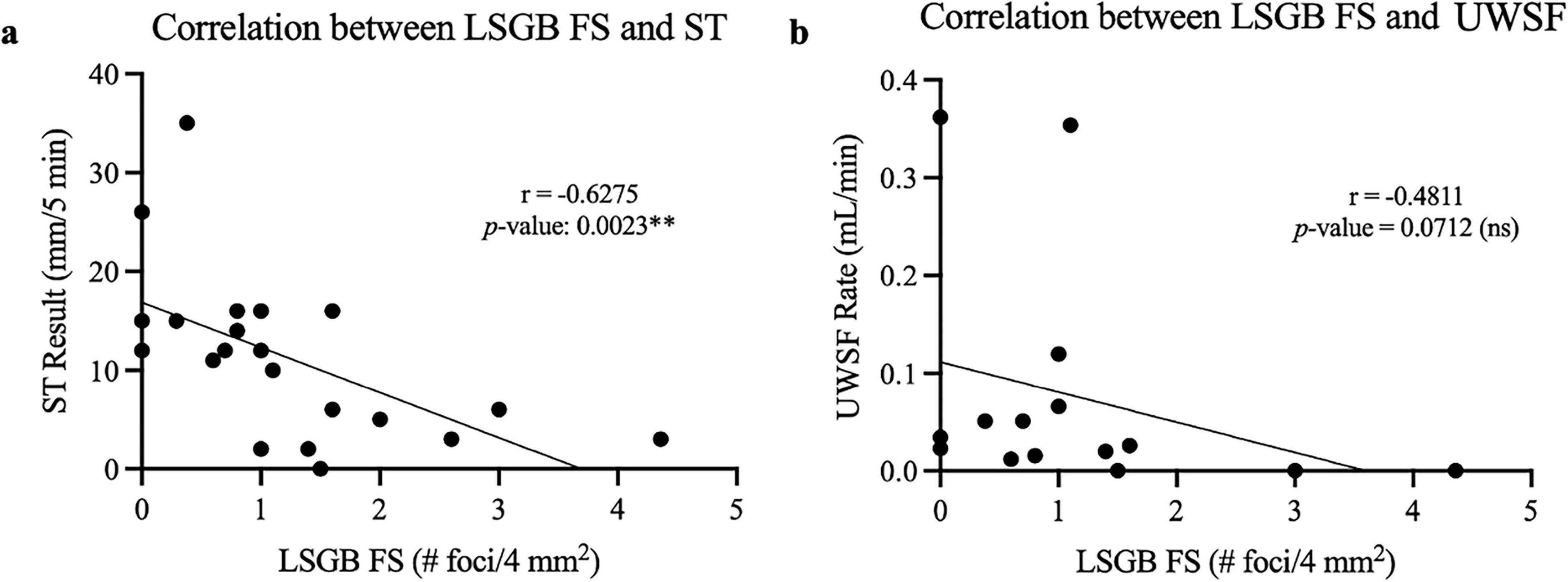 Given the significant association between abnormal LSGB and ST, we then examined whether a correlation existed between the degree of inflammation observed in the LSGB FS and the degree of objective ocular and oral dryness observed in ST and UWSF. We observed that a higher FS correlates with lower ST (p-value = 0.0023), but, interestingly, we did not observe a significant correlation between LSGB FS and UWSF (p-value = 0.0712) (Figure 3).