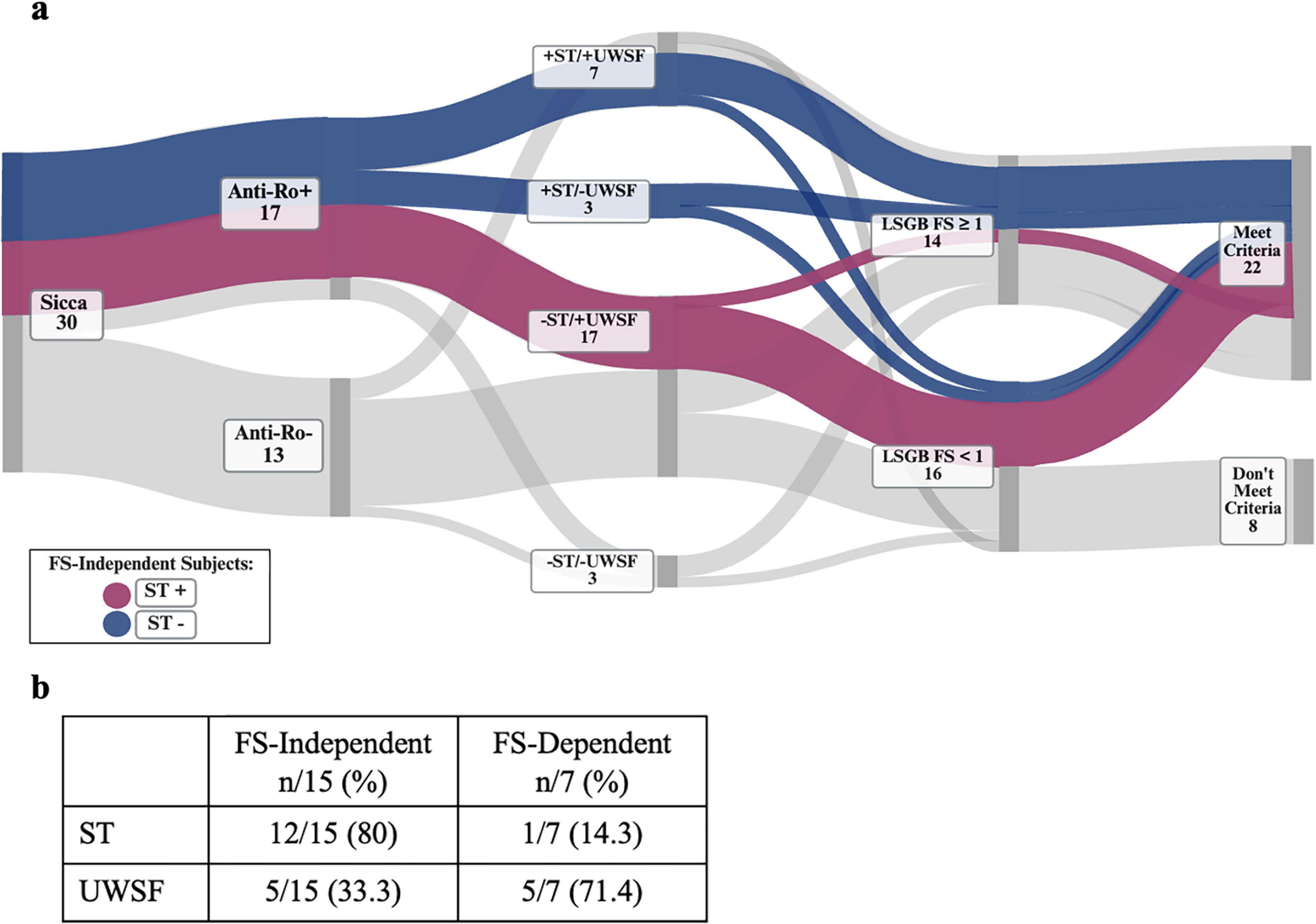 Figure 4. Concordance of ST and LSGB results in FS-independent subjects that meet SjD classification. (a) Visualization of serologic, histopathologic, and contemporaneous oral/ocular dryness testing of subjects projected in Sankey plot. FS-independent pathways to meeting ACR/EULAR SjD classification criteria are highlighted according to ST result. (b) Percentages of LSGB FS results concordant with ST or UWSF results are listed. Positive ST (purple), negative ST (blue).