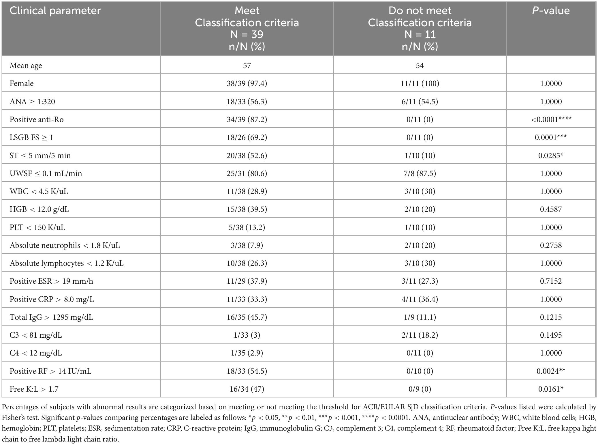Among all subjects evaluated that did and did not meet the threshold for classification criteria, we analyzed the percentage of subjects with abnormal serologic results. We found significant associations between meeting classification criteria and exhibiting positive anti-Ro antibodies (p-value < 0.0001 by definition), positive LSGB FS (p-value = 0.0001), positive ST (p-value = 0.0285), positive RF (p-value = 0.0024), and elevated free K:L (p-value = 0.0161), respectively (Table 1).
