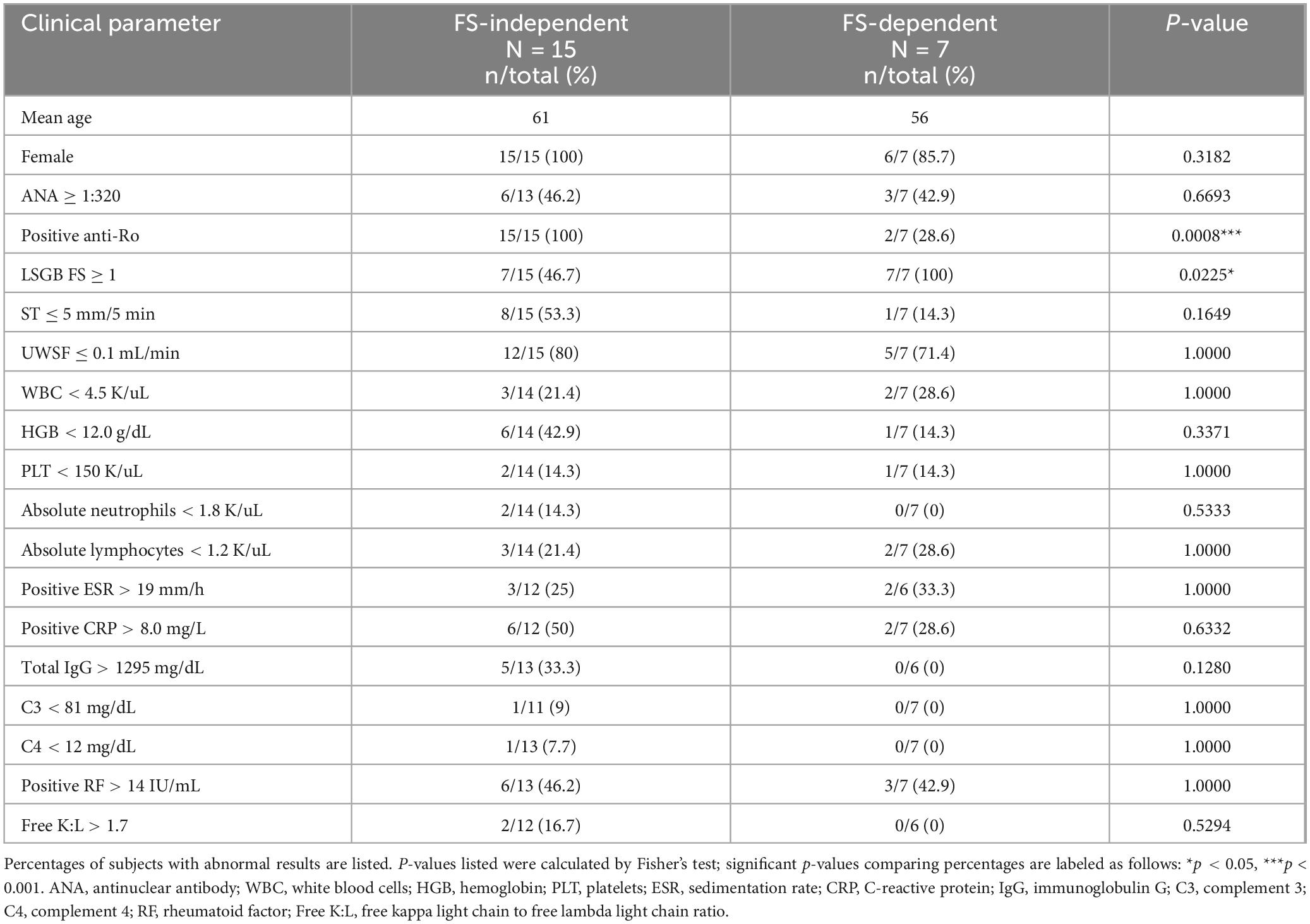 Table 2. Demographic, clinical, and serologic data of FS-independent and FS-dependent subjects that meet SjD classification.