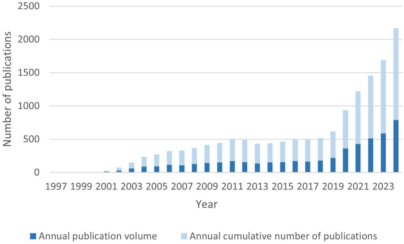 Data analysis shows a significant increase in academic output in the field of proteomics and ML from 1997 to 2024, with an average annual publication volume of 183 papers and an annual growth rate of approximately 45.14%. This trend reflects the rapid development of ML applications in proteomics, positioning it as a key direction in the intersection of life sciences and bioinformatics. Our findings support the application of Bradford’s law, a bibliometric concept suggested by Brookes (48).