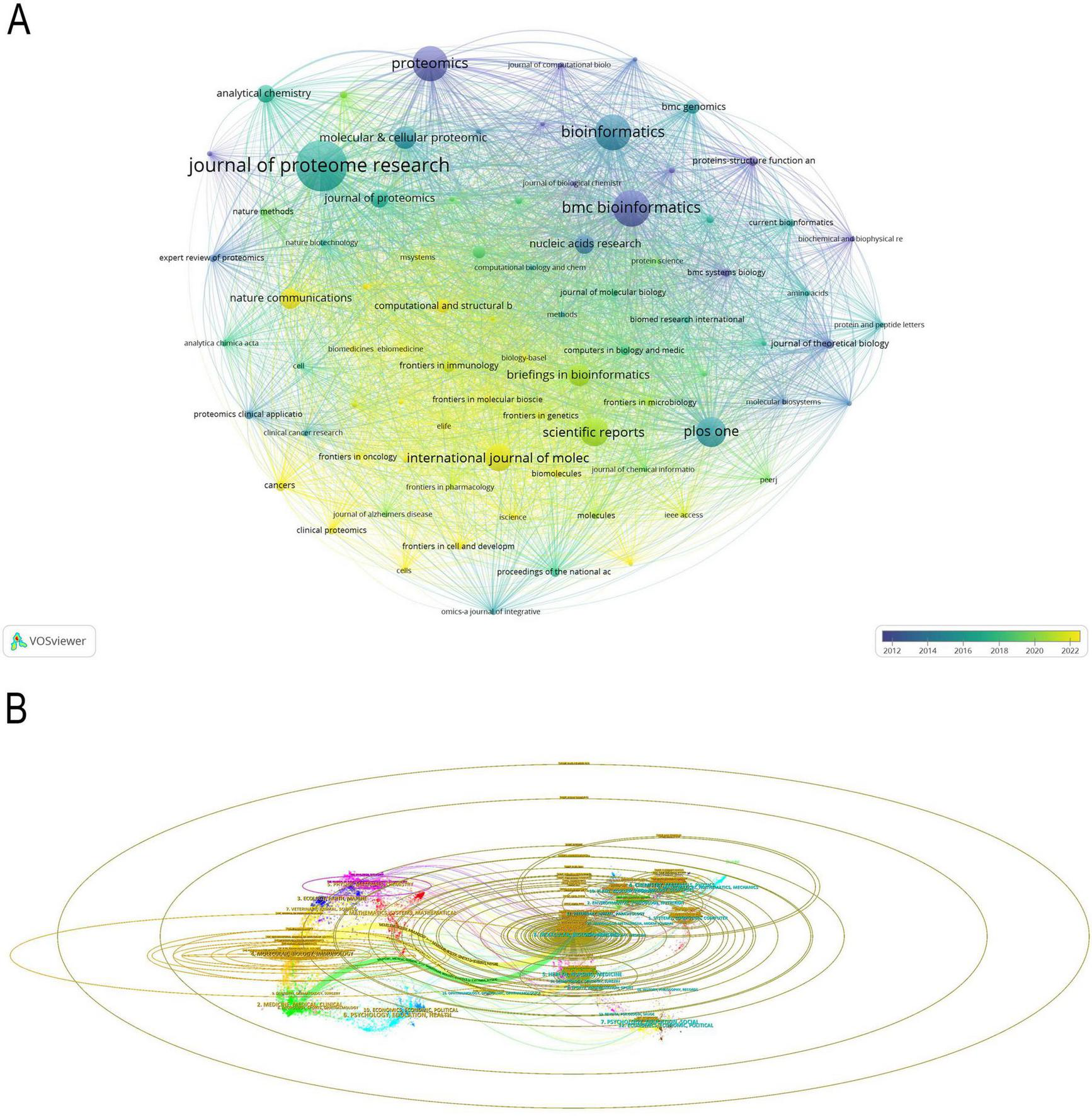 An analysis of journal publication quantities helps to grasp the development trends of a discipline. It can identify the primary platforms for high-quality research publication, providing data support for optimizing research resources. This, in turn, aids research institutions and scholars in formulating more effective research strategies and collaboration plans, thereby promoting the continuous development of the proteomics and ML field. Studying the top journals in the field like Bioinformatics and Nature Communications can offer a good sense of where the research hotspots of the discipline lay, and current trends toward the future in these cross twain field. In addition to study quality, these indicators provide useful guidance to researchers, allowing them to determine which journals would contribute most significantly to the impact and visibility of their work.