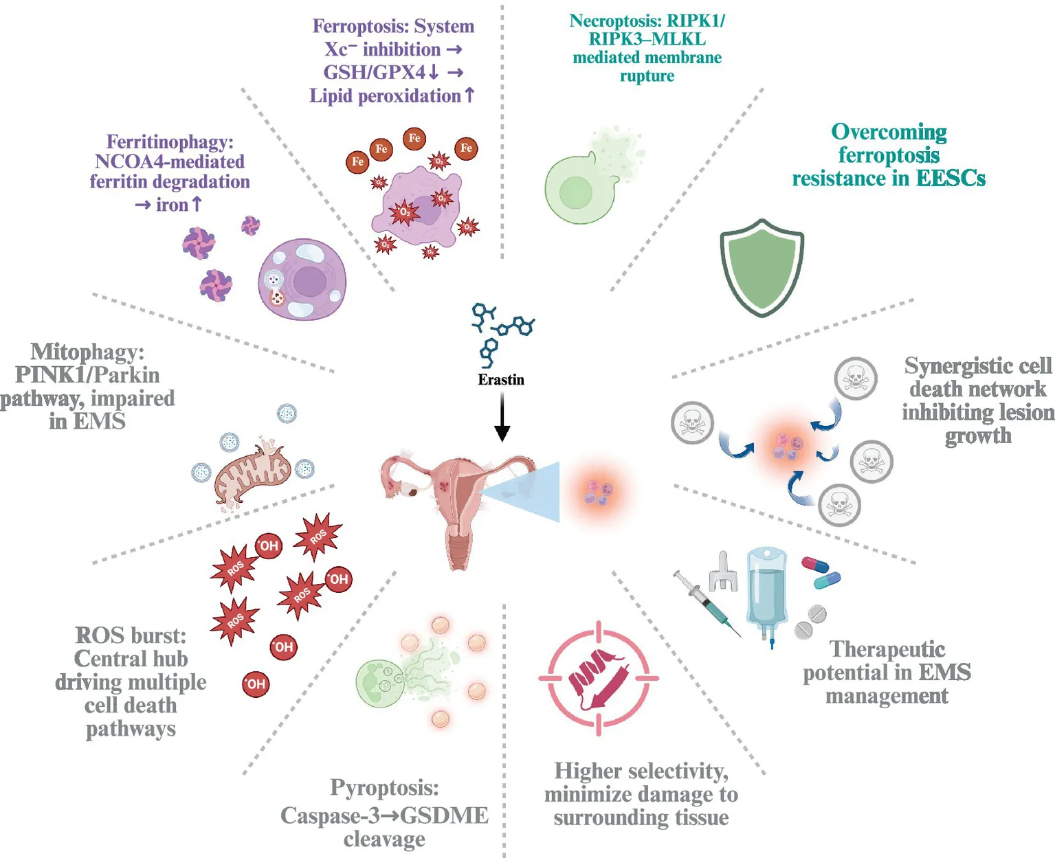 In recent years, studies have revealed that cell death plays a critical role in EMS lesions. These lesions frequently exhibit iron overload, oxidative stress, and inflammation, all of which can induce and exacerbate ferroptosis, thereby inhibiting the growth of lesion cells (10). Erastin, as a small-molecule ferroptosis inducer, works by inhibiting the system Xc− transporter-an amino acid antiporter responsible for exchanging extracellular cystine for intracellular glutamate (11)-leading to depletion of intracellular glutathione (GSH), indirectly inactivating glutathione peroxidase 4 (GPX4), and ultimately triggering ferroptosis (12). However, as research has progressed, Erastin’s induction of cell death is not limited solely to ferroptosis but may involve the combined action of multiple cell death pathways (13, 14). Based on the current evidence, we propose that the iron-overloaded, ROS-prone milieu of EMS renders EESCs susceptible to Erastin-triggered, multi-pathway regulated cell death that integrates ferroptosis with necroptotic and pyroptotic signaling, while ferritin handling and mitophagy act as key modulators of susceptibility. In turn, this coordinated engagement of death programs—together with precedent from oncology—supports the view that Erastin has therapeutic potential for EMS when exposure is directed preferentially to lesions and minimized in normal tissues.