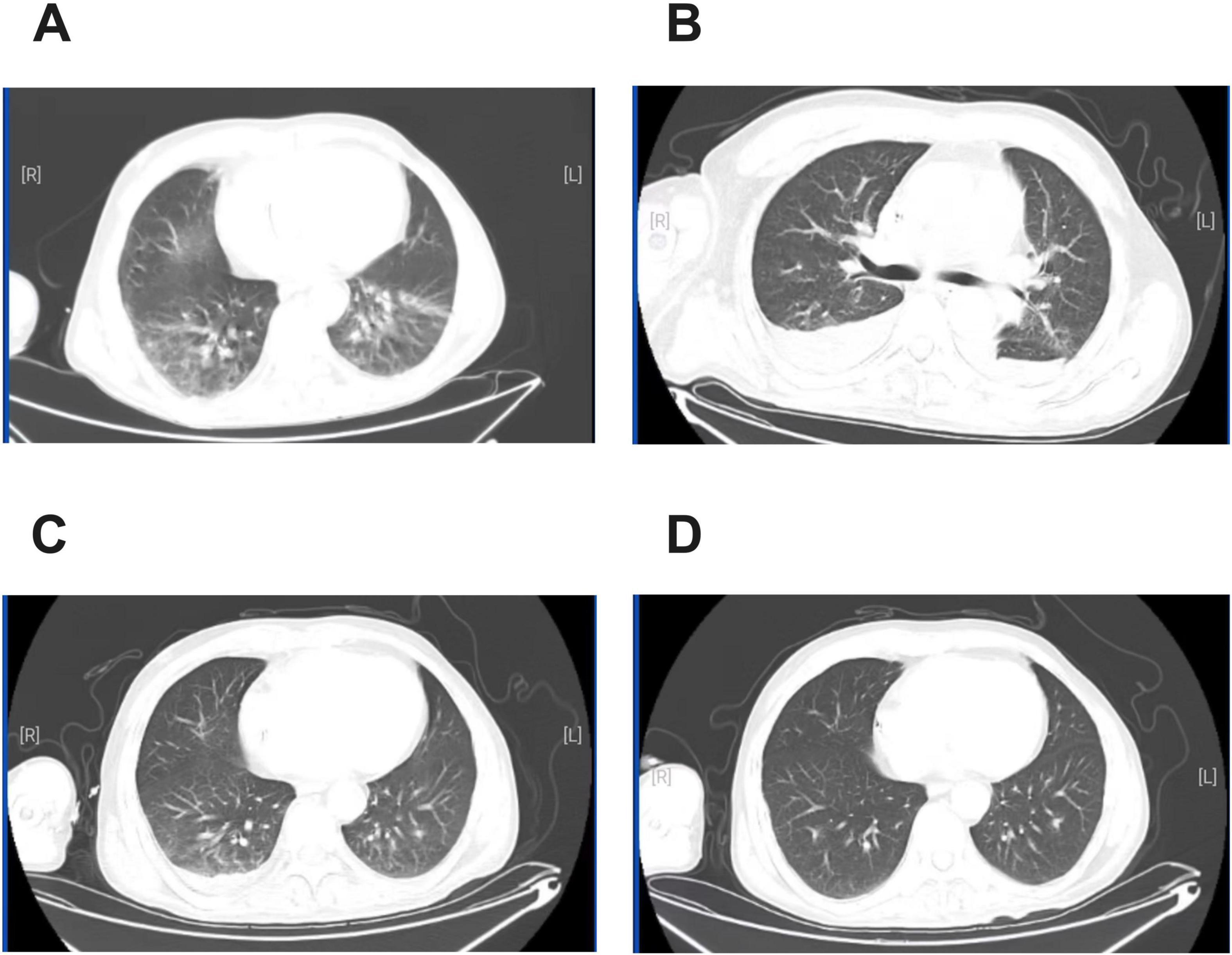 ![Four panels labeled A, B, C, and D show axial chest CT scans. Each scan depicts the lungs with varying degrees of clarity and contrast, highlighting pulmonary structures such as bronchi and blood vessels. Labels [R] and [L] indicate the right and left sides.](https://www.frontiersin.org/files/Articles/1595190/fmed-12-1595190-HTML/image_m/fmed-12-1595190-g001.jpg)
