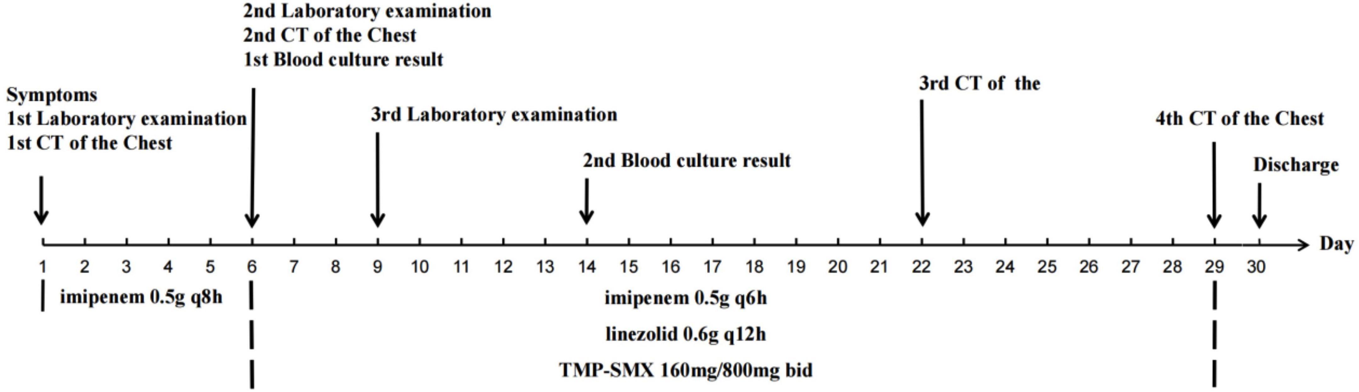 In our case, the patient was initially treated with imipenem monotherapy, but unfortunately, the treatment was unsuccessful. According to the results of blood culture, the patient was subsequently treated with TMP-SMX, imipenem, and linezolid for 23 days. Following discharge, the patient continued to receive oral TMP-SMX for 12 months.