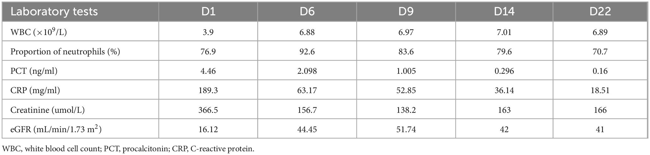 The patient was a 55-year-old man weighing 56.5 kg. BMI was 18.66 kg/m2. He was diagnosed with diffuse large B-cell lymphoma five months previously and was undergoing regular chemotherapy. He was admitted to our hospital with fever for 3 days. His vital signs were as follows: temperature 39°C, blood pressure 87/50 mmHg, pulse 108 beats/min, and respiratory rate 26 breaths/min with an oxygen saturation of 95% on room air. Laboratory examination showed white blood cell count (WBC): 3.9 × 109/L, the proportion of neutrophils was 76.9%, C-reactive protein (CRP): 189.3 mg/L, Procalcitonin (PCT): 4.46 ng/mL, creatinine: 366.5 μmol/L, eGFR: 16.12 mL/min (Table 1). Chest Computed Tomography (CT) was obtained, showing streaks, nodules and patchy abnormal shadows in both lungs (Figure 1A). The patient was diagnosed with septic shock. Blood and sputum cultures were obtained and the patient was initially empirically treated with imipenem (0.5 g q8h iv) for 5 days. On day 6 of treatment (D6), the temperature was 39°C, WBC count was 6.88 × 109/L, the proportion of neutrophils was 92.6%, the CRP level was 63.17 mg/L, PCT decreased to 2.098 ng/mL, the creatinine was 156.7 μmol/L (Table 1). The follow-up CT scan revealed reticular shadows, nodules, patchy infiltrates, and areas of consolidation in both lungs with ill-defined margins; atelectasis in the lower lobes of both lungs, and bilateral pleural effusion (Figure 1B). Blood aerobic culture was positive on the automatic blood culture system. The identification was performed by MALDI-TOF MS (Autof MS 1000), confirming the isolate as Nocardia cyriacigeorgica. The confidence score was 99.9%. Due to challenges associated with antimicrobial stability and the fastidious growth characteristics of Nocardia spp., most clinical laboratories in China do not routinely perform susceptibility testing. The antibiotic regimen was changed to imipenem (0.5 g q6h iv), linezolid (0.6 g q12h iv) and trimethoprim-sulfamethoxazole (TMP-SMX) (160 mg/800 mg bid) for 23 days (13). After counseling on risks of undiagnosed intracranial pathology, the patient declined brain imaging studies due to absence of symptoms suggestive of intracranial infection (13, 14). After 3 days of treatment (D9), the patient’s temperature was around 38°C. Neutrophil%, CRP, PCT and creatinine decreased (Table 1). On D14, the patient’s clinical condition improved. A repeat blood culture was negative. On D22, chest CT showed significant reduction in the lesion area (Figure 1C). The patient’s temperature was normal. On D29, the result of chest CT was bilateral pulmonary nodules (Figure 1D). The patient was afebrile. The patient was discharged from the hospital on the 30th day after the admission. There were no adverse drug reactions observed during treatment. After discharge, the patient was asked to continue oral TMP-SMX and repeat chest CT imaging regularly (clinical course summarized in Figure 2).