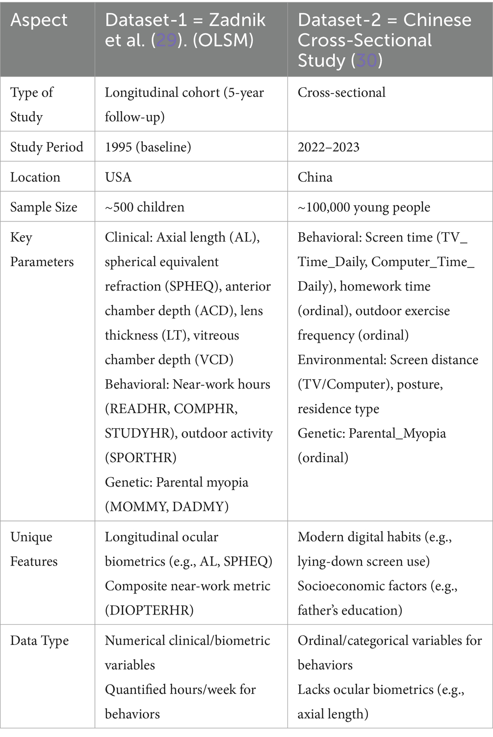 The two datasets share core similarities regarding demographic variables (age, gender), parental myopia history, and behavioral factors (outdoor activity, near-work hours), enabling partial harmonization of risk predictors such as genetic predisposition and environmental exposure. Both capture critical myopia drivers but differ structurally: the dataset-1 cohort (USA, 1995, n = 500) provides longitudinal data and detailed ocular biometrics (axial length, spherical equivalence), while the Chinese cross-sectional dataset (2022–2023, n = 100,000) emphasizes modern lifestyle factors (screen time, posture) with ordinal coding. Key challenges include reconciling numerical (dataset-1) and ordinal (dataset-2) variables, temporal/geographic biases (pre-digital vs. tech-era behaviors), and study design mismatch (cohort vs. cross-sectional). However, synergies exist in leveraging the Chinese dataset’s scale to identify broad risk patterns and dataset-1’s clinical depth to model biological mechanisms. Techniques such as transfer learning could merge their strengths, validating universal predictors (e.g., parental myopia, outdoor activity) while accounting for era-specific confounders to build a global myopia risk framework integrating genetic, behavioral, and clinical dimensions.