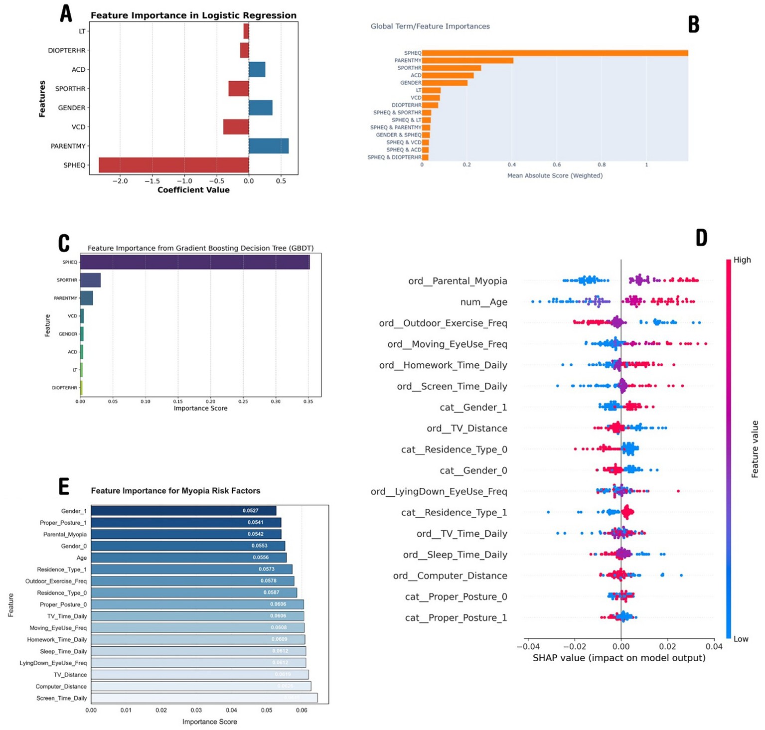 These model outputs align with myopia research, confirming SPHEQ as the strongest negative predictor, reflecting the severity of myopia. Parental history (PARENTMY) also shows a strong correlation, highlighting genetic influence. Outdoor activity (SPORTHR) is negatively associated, supporting its protective effect. Conversely, VCD is a key positive predictor, linking axial elongation to myopia progression. Gender (GENDER) also shows a positive effect, possibly due to a higher prevalence in female individuals. Notably, DIOPTERHR is not a dominant predictor, suggesting that genetic and axial growth factors play a more significant role (Figure 2A).
