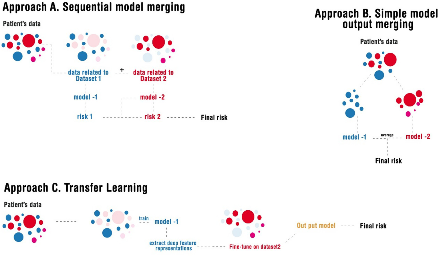 In this method, patient data were first managed separately for dataset-1 and dataset-2, ensuring that each model specialized in the specific data structure it was trained on. The first model trained on dataset-1 was used to generate a risk score, which was then passed to the second model trained on dataset-2 for final risk estimation. In this sequential merging approach, we retained the strengths of each dataset while capturing its domain-specific predictive insights. The implementation of this approach relied on Python libraries such as scikit-learn for model chaining, NumPy for numerical processing, and Pandas for data alignment. The primary rationale behind this approach was to retain dataset-specific nuances; while maintaining dataset-1’s clinical depth, dataset-2’s modern lifestyle focus was also preserved and resulted in improved predictive performance.