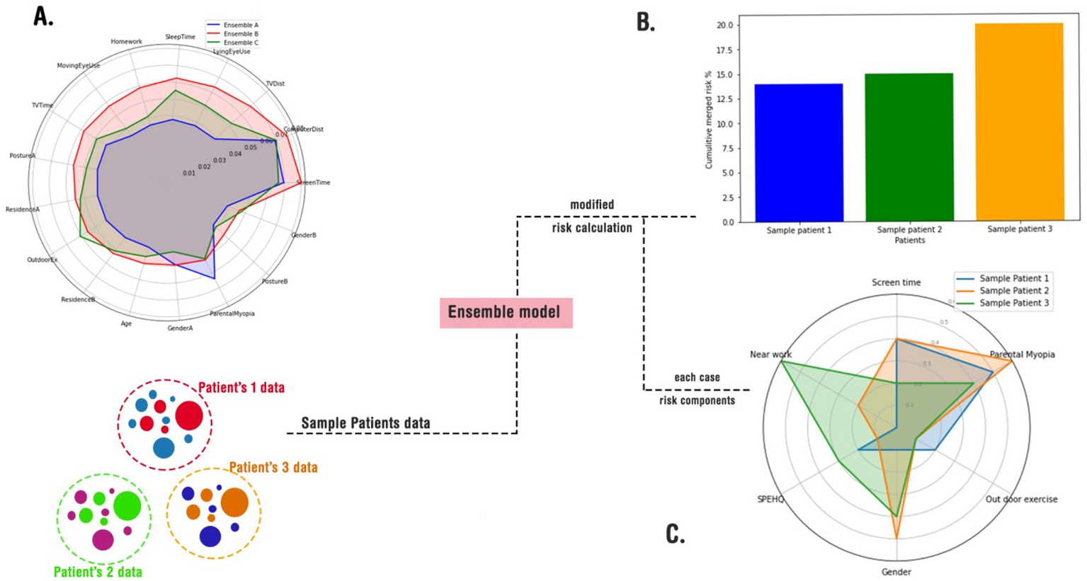 As discussed in the method, we implemented three approaches for merging these models (Figure 3). The radar plot highlights variations in feature importance across the three ensemble approaches, revealing how different model merging strategies influence the final output. Sequential merging (Ensemble A - blue) preserved the dominance of ScreenTime and Near work, reflecting dataset-specific strengths but slightly underrepresenting secondary features such as OutdoorEx and Residence B (in an urban area). The simple averaging approach (Ensemble B - red) balanced contributions from both models, ensuring LyingEyeUse and TVDist (Near Work) gained more prominence, although it lacked the adaptability to refine feature relationships deeply. Transfer learning (Ensemble C - green) exhibited the most flexibility, redistributing feature weights significantly by amplifying OutdoorEx and Parental myopia while maintaining core influences such as ScreenTime and ComputerDist (Near works), suggesting that it adapts better to evolving patterns. Overall, sequential merging maintains dataset-driven strengths, simple averaging ensures fair representation, and transfer learning offers the highest adaptability, making it a robust choice for integrating diverse datasets with dynamic trends (Figure 4A). A sample of how the ensemble model works is shown in Figures 4B,C.