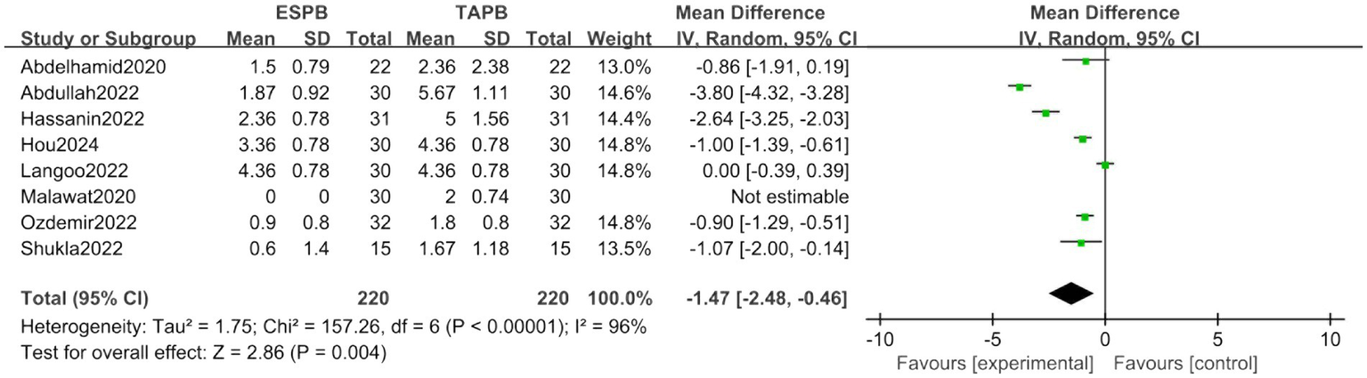 Eight trials revealed superior analgesic efficacy in the ESPB group (MD = −1.47, 95% CI [−2.48, −0.46], p < 0.05), accompanied by significant heterogeneity (I2 = 96%; Figure 5).