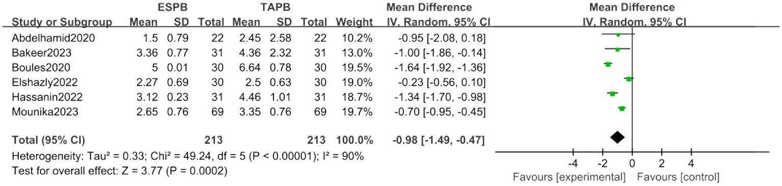 Forest plot of postoperative 2-h pain score between ESPB and TAPB groups. (ESPB, erector spinae plane block; TAPB, transversus abdominis plane block).
