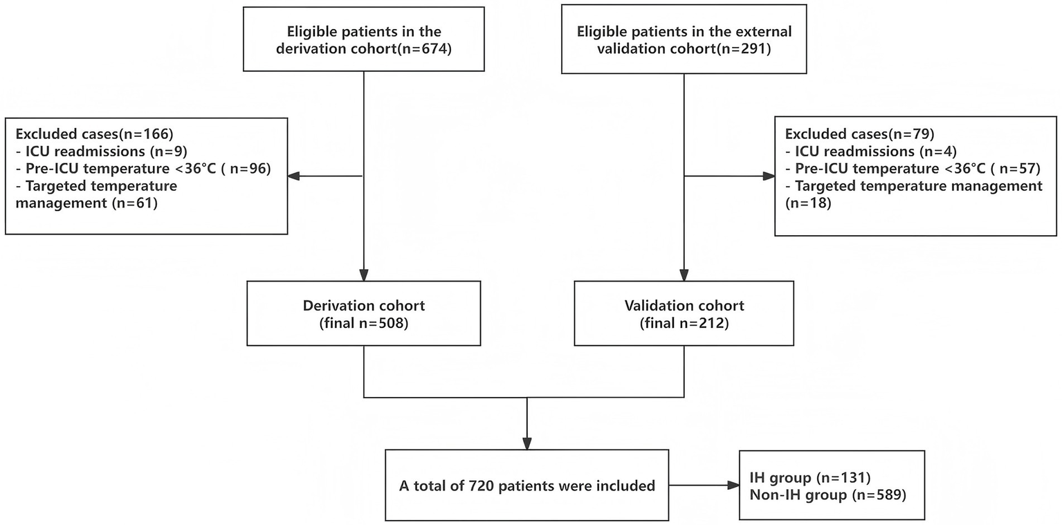 A final total of 720 study participants were included, comprising 589 non-IH patients and 131 IH patients, with an IH incidence of 18.19%. The derivation cohort included 508 cases (90 IH patients, 17.7%), and the external validation cohort included 212 cases (41 IH patients, 19.3%), Figure 1 shows the flow diagram of patient enrollment and analysis in the study. Table 1 presents the baseline characteristics of IH and non-IH groups in both cohorts.