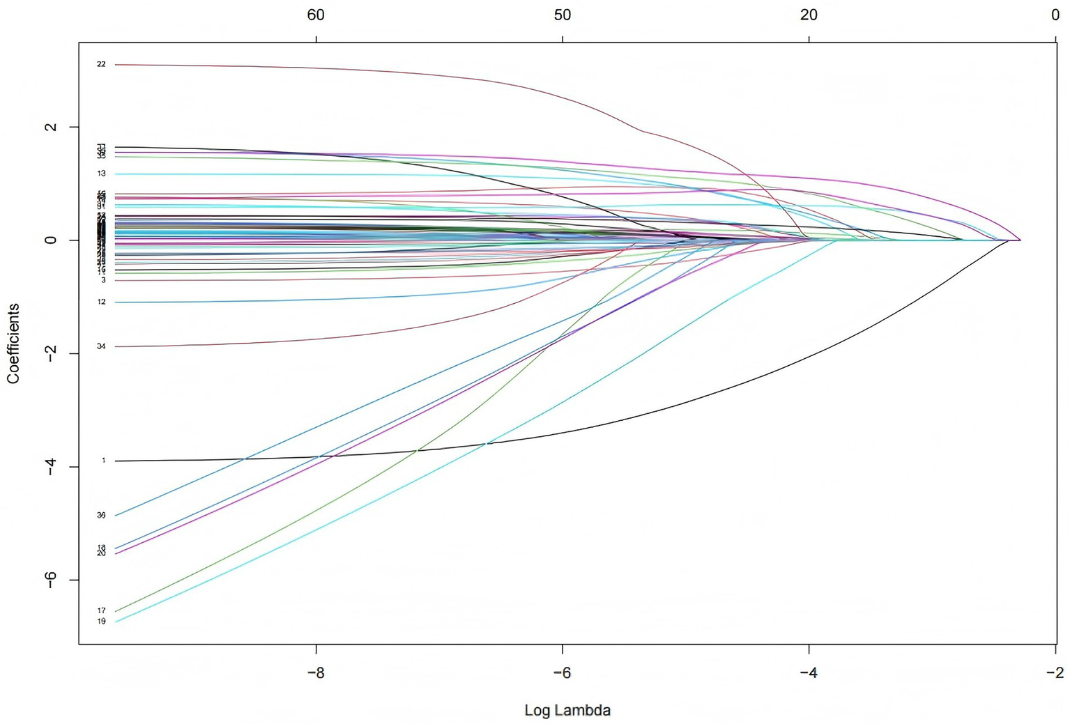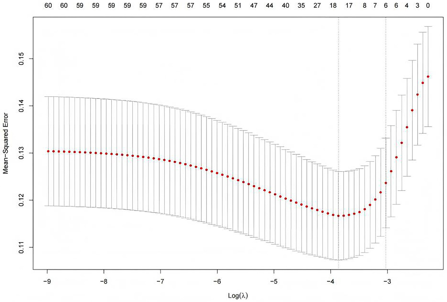 Variables with >20% missing data were excluded, and the remaining missing values were imputed using random forest imputation. Continuous variables were then standardized to ensure uniform scaling for LASSO regression, which is sensitive to variable magnitude. This step prevents variables with larger units from dominating feature selection and facilitates algorithm convergence while enabling direct comparison of variable importance. The penalty parameter λ was determined through 10-fold cross-validation. This selected λ value was then applied in the LASSO regression equation to identify independent predictors with non-zero coefficients, thereby ensuring only relevant variables were retained in the final model.