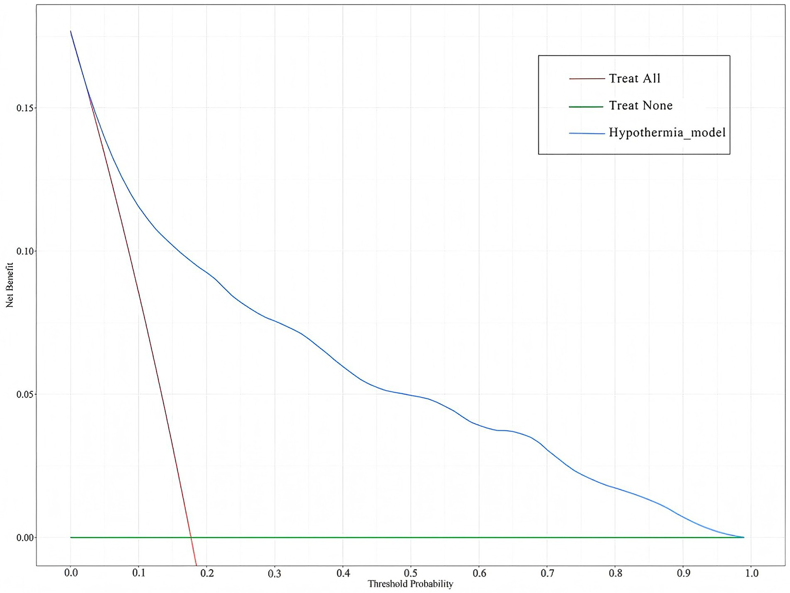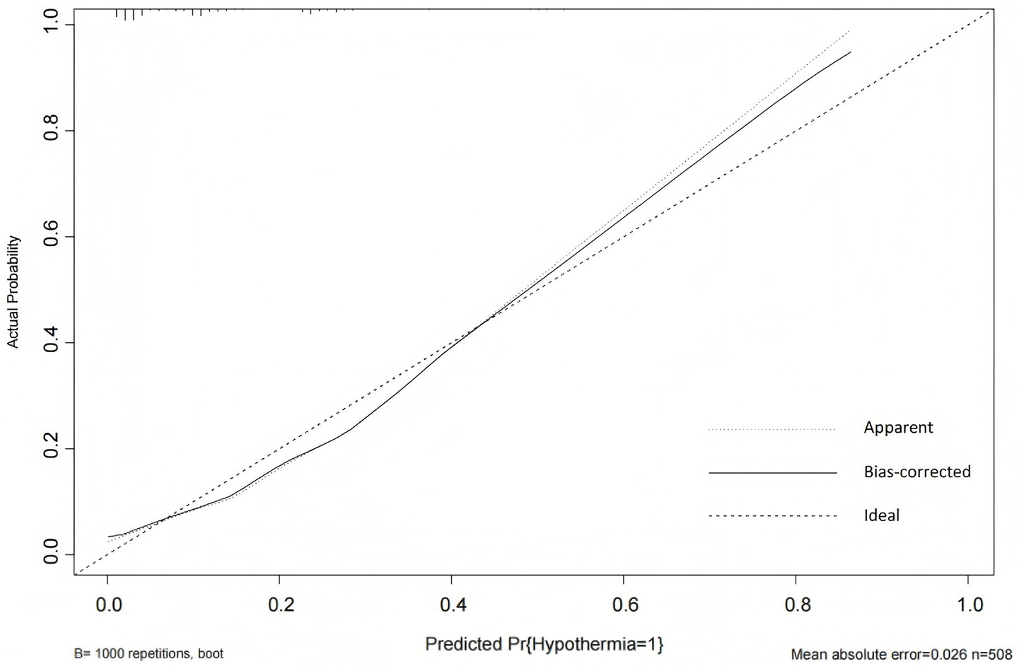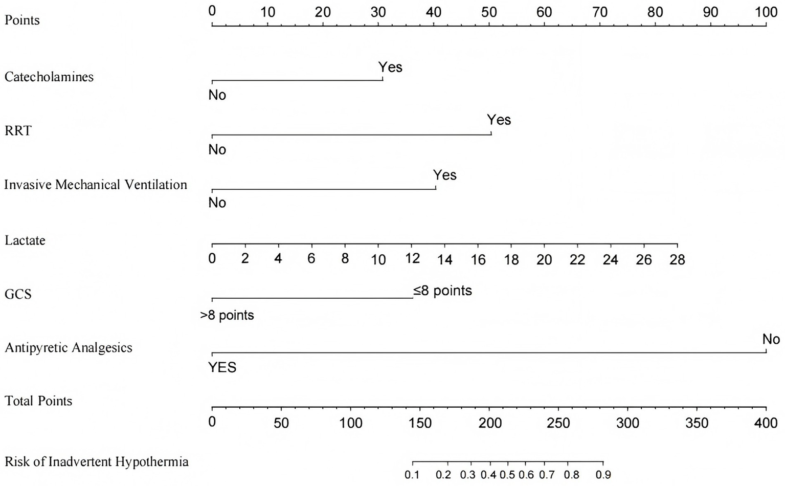 Hypothermia is typically defined as a patient’s body temperature falling below 36 °C, resulting from excessive heat loss, reduced heat production, or impaired thermoregulation (1, 2). Hypothermia that occurs in patients, excluding cases of targeted temperature management, is often referred to as inadvertent hypothermia (IH) (3). IH is a common clinical abnormality in intensive care unit (ICU) patients, with an incidence ranging from 16 to 25% (1, 4, 5). IH can exacerbate or lead to severe adverse outcomes, including coagulation dysfunction, metabolic disturbances, elevated cardiovascular risk, organ dysfunction, immunosuppression, heightened infection risk, and delayed sedation recovery (6–10). Additionally, it contributes to prolonged hospital stays, increased healthcare costs, and poses a significant threat to patient safety (11). Studies have demonstrated that IH is an independent risk factor for ICU patient mortality, with a reported mortality rate ranging from 22 to 31% among ICU patients who develop IH (1, 12). Furthermore, mortality rates exhibit a positive correlation with both the severity of hypothermia and the prolonged duration of IH (3). Therefore, early identification of risk factors and stratification of high-risk populations are essential for preventing or mitigating the progression of IH.