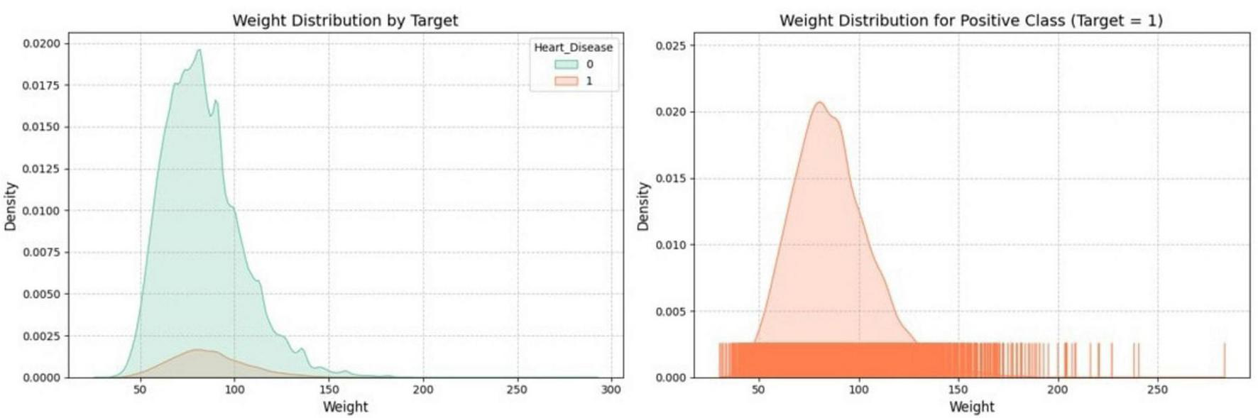Figure 4 visualizes the distribution of the “Weight” feature through two key plots. One plot shows the density distribution of “Weight” for both classes of a binary target variable, while the other focuses specifically on the distribution of “Weight” within one class, like the positive class. The plots use distinct colors to differentiate between classes, which helps understand the relationship between “Weight” and the target variable within the dataset.