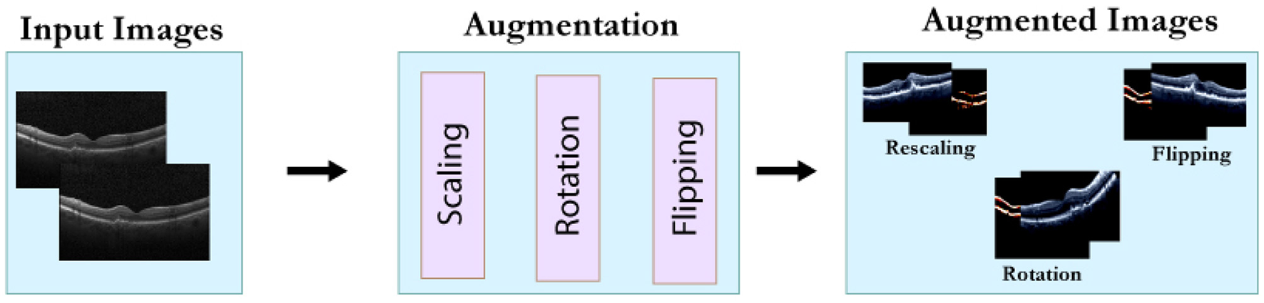 After scaling the images, data augmentation was applied using a 30° rotation and horizontal flipping. Samples of the augmented images are illustrated in Figure 3.
