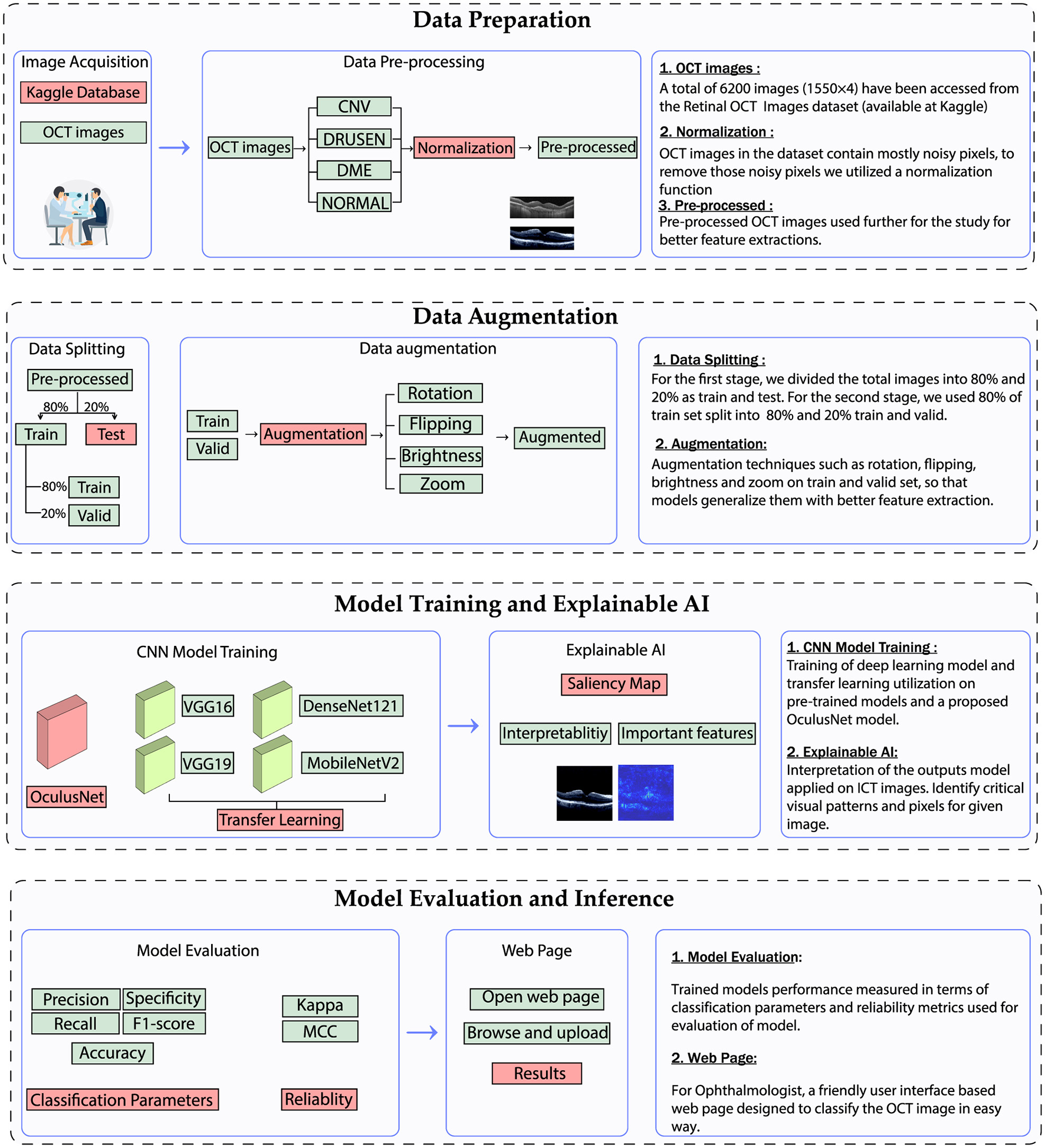 The coding flow utilized for the experiments was organized into four main stages: data preprocessing, building model architecture, model training, and model evaluation. Initially, the necessary libraries were imported, followed by the dataset, where preprocessing functions were applied to standardize images and split the dataset into training, validation, and testing subsets. Hyperparameters were selected, and data augmentation techniques were employed using an image data generator library to enhance the model's generalization capability. For building the models, the OculusNet model was defined from scratch by adding convolutional, max-pooling, flatten, and dense layers, after which a model summary was printed. Similarly, pre-trained models were imported from Keras libraries with ImageNet weights, followed by adding flatten and dense layers and printing their summaries. During model training, the models were trained on the training dataset and validated on the validation dataset, while loss and accuracy graphs were generated. The model evaluation step involved obtaining the confusion matrices and classification reports for both validation and testing datasets to comprehensively assess the models' performance. This structured approach ensures a coherent and efficient workflow, leading to reliable and reproducible results.
