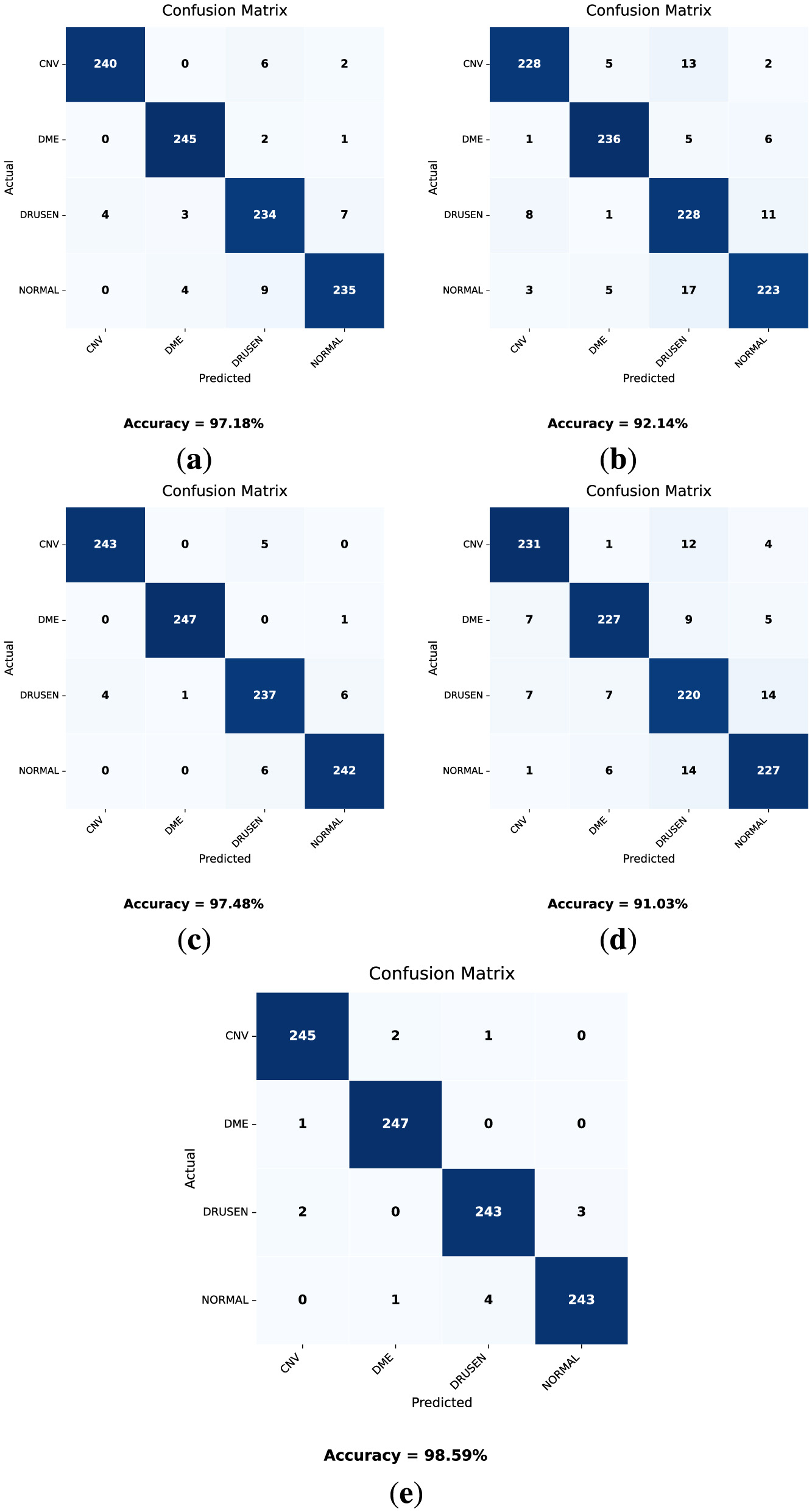 Figure 11. Confusion matrices on the test dataset for each model (a) DenseNet121. (b) VGG16. (c) MobileNetV2. (d) VGG19. (e) OculusNet.