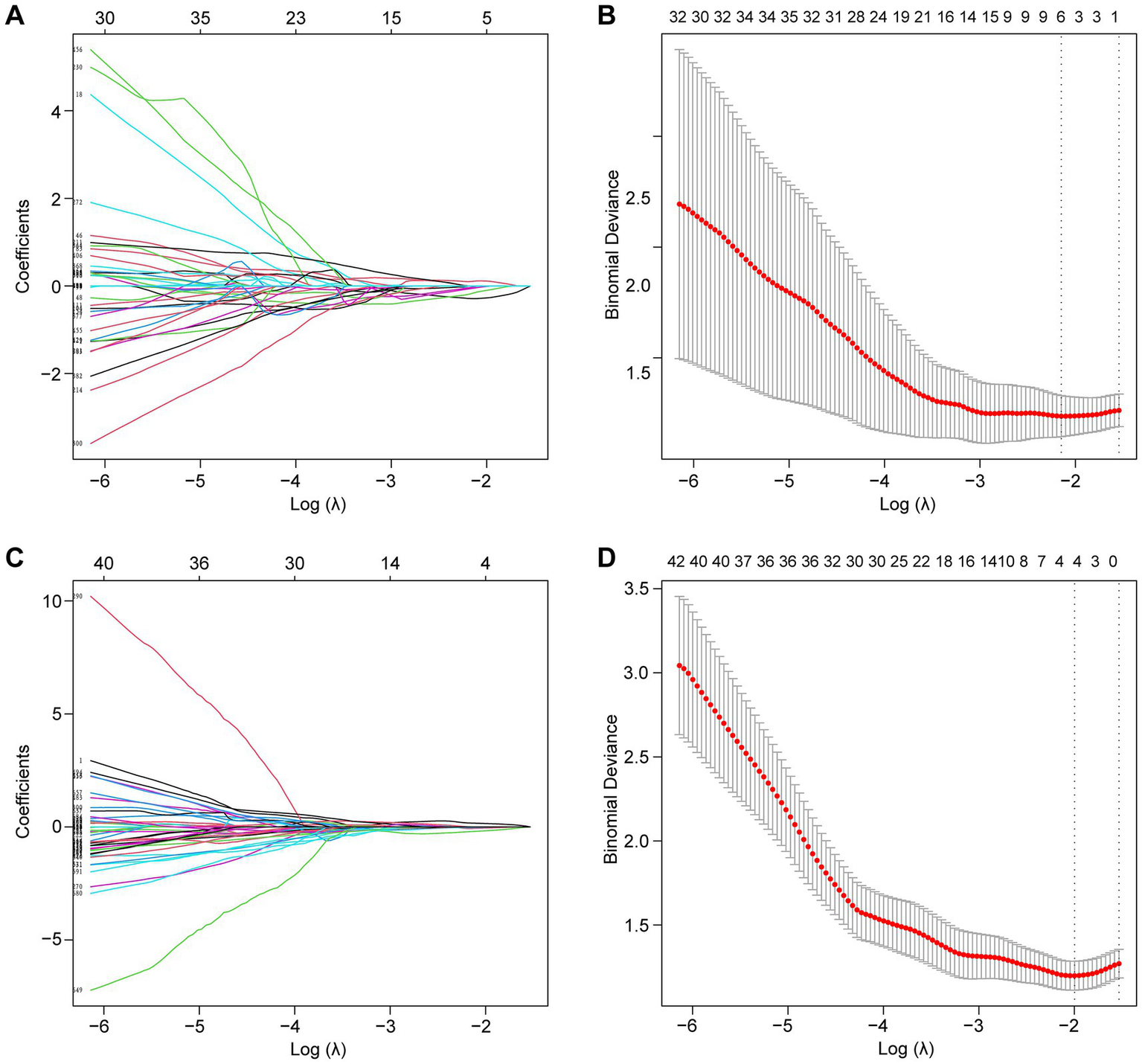 Chest contrast-enhanced CT images were preprocessed using MATLAB 2014b1 with: (1) Spatial normalization: Rigid registration to the INHALE chest CT atlas via ANTs (v2.3.3) using mutual information; (2) Isotropic resampling: Resampling normalized images to 1 mm isotropic voxels using B-spline interpolation. Following the guidelines of ICRU 83 (27), a radiation oncologist with 10 years of experience in lung cancer treatment delineated the GTVp and GTVnd without access to patient information. ITK-SNAP (version 3.8.0; http://www.itksnap.org) was used to manually label slices layer-by-layer (28). GTVp was delineated in the lung window (WW 1600 HU, WL − 600 HU), and GTVnd in the mediastinal window (WW 250 HU, WL 50 HU). The criteria for defining GTVnd included: (1) short-axis diameter ≥1 cm, (2) presence of ≥3 clustered lymph nodes within a single station, (3) pathological confirmation of metastasis in mediastinal lymph nodes (in select patients), or (4) PET-CT SUVₘₐₓ > 2.5 in the region (in select patients). After completing the annotations were completed, the region of interest (ROI) was designated. For each patient, 1,834 radiological features were extracted from the ROIs. These features were standardized using the Z-score and then screened by an F-test in ANOVA, where F is defined as the ratio of between-group variance to within-group variance. To avoid overfitting, LASSO regression with 10-fold cross-validation (via glmnet in R) was performed on each training subset to select the λ minimizing mean square error. Only features selected in ≥80% of folds were retained for the final model. Finally, logistic regression was used to construct the radiological models.
