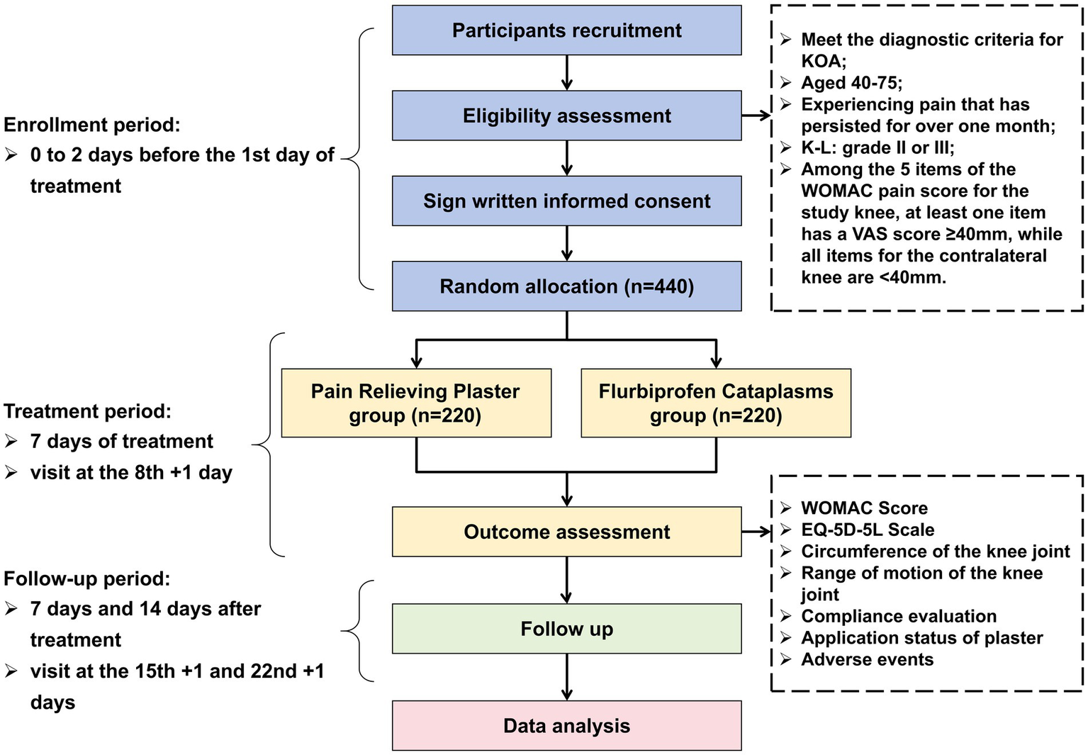 Flowchart of the trial design. KOA, Knee Osteoarthritis; K-L, Kellgren-Lawrence grading scale; WOMAC, Western Ontario and McMaster Universities Osteoarthritis Index; VAS, visual analogue scale; EQ-5D-5L, European Quality of Life 5 Dimensions 5 Levels.