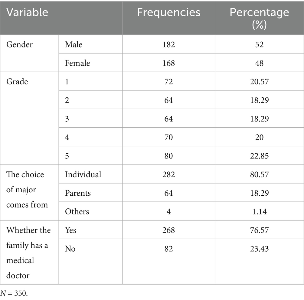 In order to test the four hypotheses of this study, a quantitative research method was conducted. The study purposefully selected undergraduates from the clinical medicine major at a medical university in central China as the research subjects, as they reflect the lowest pass rate for CMPQE in terms of academic performance. According to the official website of this medical university, there are currently 1,928 undergraduates enrolled in the clinical medicine major. Following a stratified sampling method with a rate of no less than 16% per grade, a total of 350 undergraduates were selected as the sample, comprising undergraduates from the first to the fifth year in order to ensure that the potential interference of study duration on the research results was minimized. All participants volunteered to join the study after being fully informed of its contents and signed an informed consent form before the study began. After obtaining permission from the relevant department of the university, an online questionnaire was used to collect data efficiently, with ample time of 40 to 50 min set aside for each participant to complete the questionnaire. The data collection process lasted for one month from June 2024 onwards. All procedures were conducted in accordance with the ethical principles outlined in the Declaration of Helsinki. Table 1 presents the demographics of the participants.