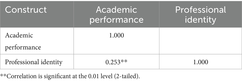 Spearman correlation analysis was used to explore the relationship between professional identity and academic performance as well as the strength of the relationship, and the results are shown in Table 3.