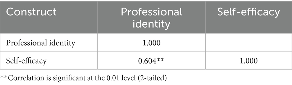 According to the suggestion of Haldun Akoglu (38), the correlation is moderate strength when the correlation coefficient is more than 0.4 but less than 0.7 (38). As shown in Table 4, there is a significant positive correlation between professional identity and self-efficacy, and the strength of the correlation is moderate (r = 0.604, p < 0.001).