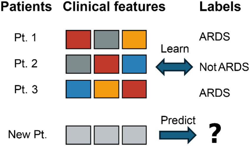 ARDS is frequently missed or diagnosed late, which significantly hinders timely intervention and worsens patient prognosis (4, 5). The limitations of the Berlin definition have prompted efforts toward a new global definition aimed at increasing diagnostic sensitivity (5). To address this, ML models are being developed to predict ARDS onset hours to days in advance, leveraging diverse data sources such as EHR, medical imaging, and biomarkers (6). See Figure 2 for a schematic overview of the supervised learning workflow used for ARDS prediction. Deep learning, particularly CNNs, demonstrates substantial potential in analyzing CXRs and CT scans for identifying ARDS signs, often surpassing human interpretation accuracy (7). Additionally, VWD has emerged as a novel data source for early ARDS detection through DNNs (8).