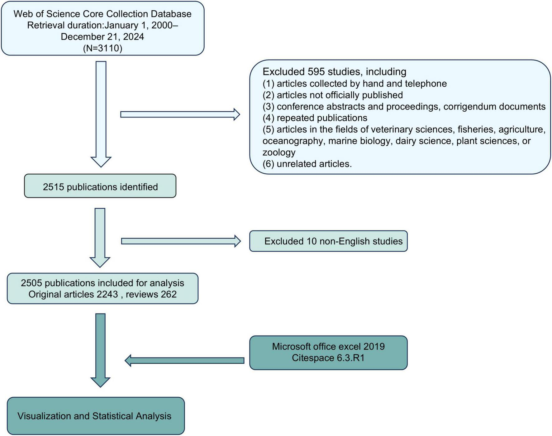 The PRISMA flow chart outlines the literature screening process (Figure 2). An initial search of 3,110 studies from the Web of Science Core Collection database between January 1, 2000 and December 21, 2024 was conducted on December 21, 2024. Of these, 595 were excluded due to non-peer-reviewed sources (e.g., conference abstracts) or irrelevant fields (e.g., veterinary medicine). Subsequently, 10 non-English studies were removed, leaving 2,515 publications. After further review, 10 studies were removed due to incomplete metadata or irrelevant nature, and 2,505 studies were finally included for analysis, including 2,243 original articles and 262 reviews, with a total of 101,150 references. These articles were exported to Microsoft Office Excel 2019 and CiteSpace 6.3.R1 for visualization and bibliometric analysis.
